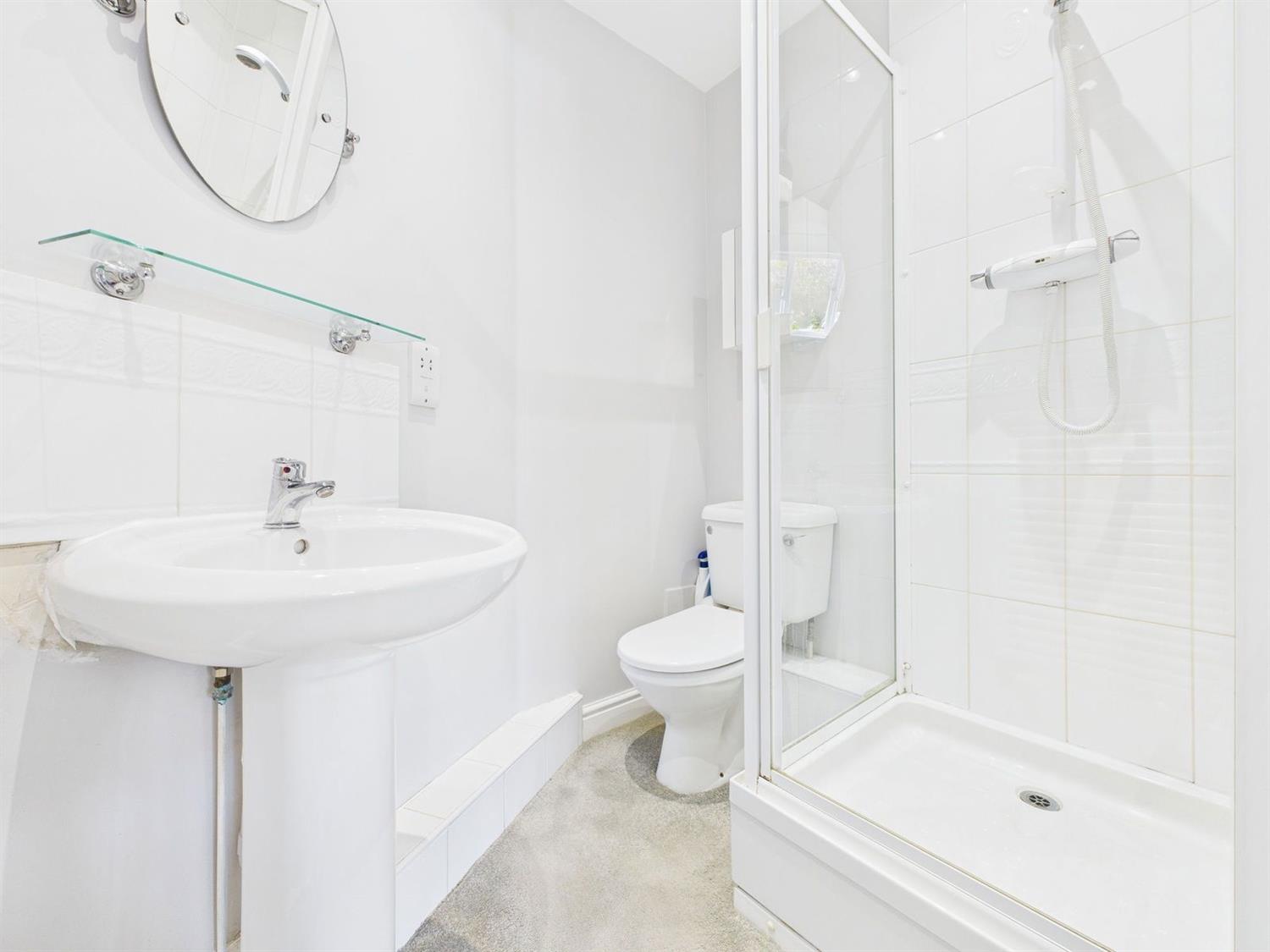 Ensuite Shower RoomA modern white shower suite comprising a corner shower cubicle with shower mixer and wall mounted shower attachment, low-level WC, pedestal wash hand basin with mixer tap, shaver point, heated towel radiator, downlighting, and extractor fan.