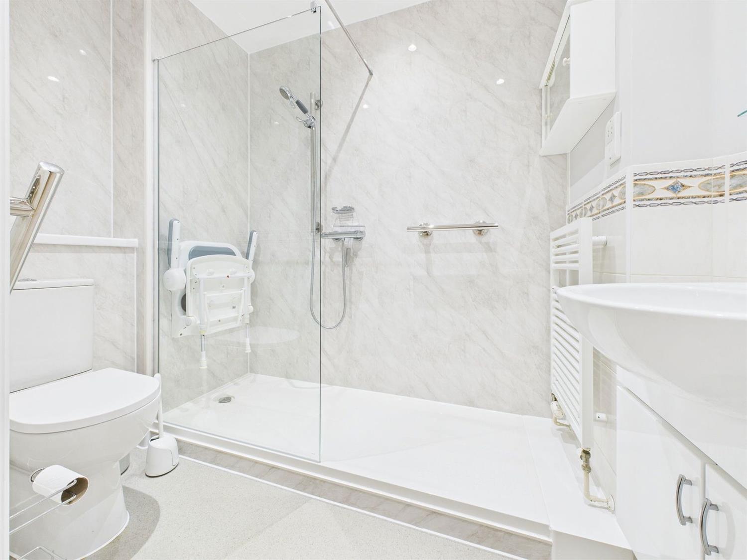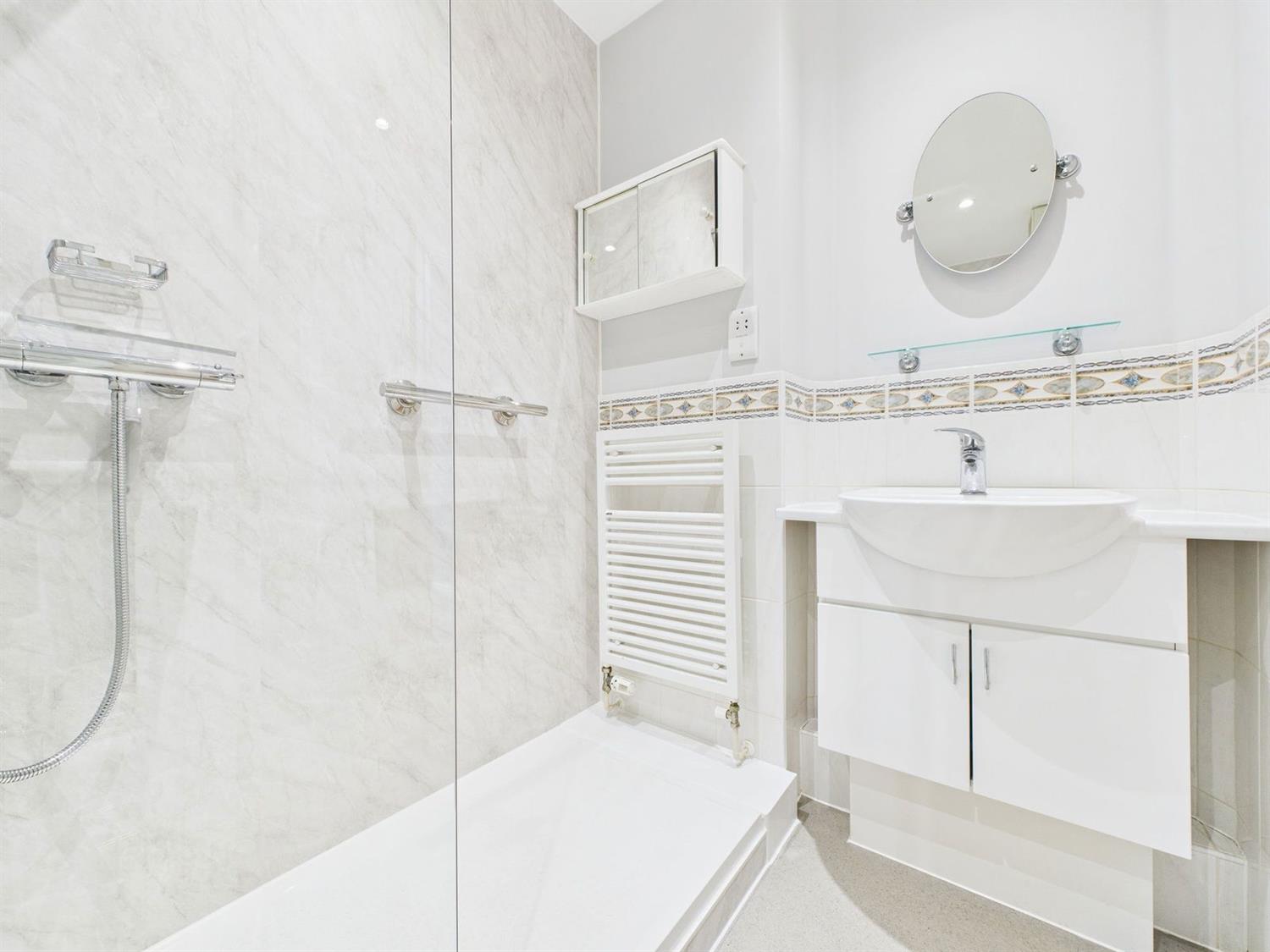 Shower RoomA recently fitted shower suite comprising an oversized walk-in shower with shower mixer, handheld shower attachment, heated towel radiator, low-level WC with dual flush, vanity wash handbasin with storage beneath and mixer tap over, shaver point, downlighting, and extractor fan.