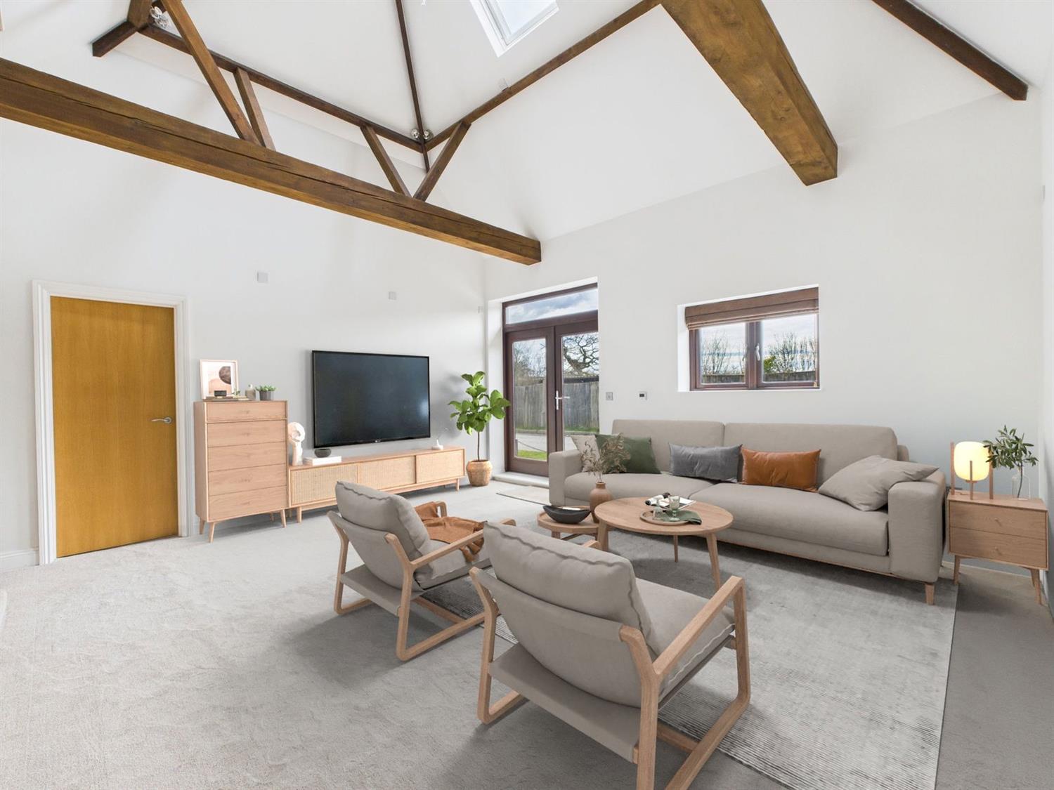 With twin double glazed side aspect French doors and double glazed door to the rear garden. Featuring high vaulted ceiling with exposed beams, built in corner display units, media console, twin satellite cable, zoned under floor heating, staircase to