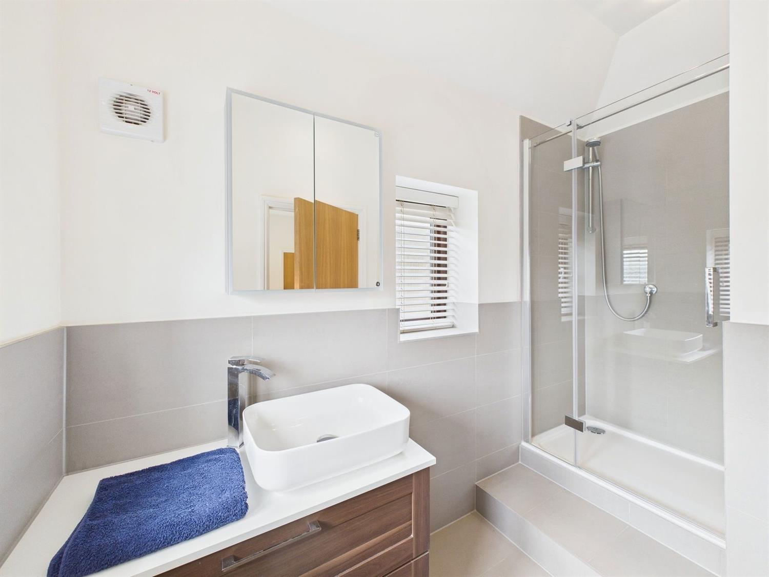 Frosted double glazed double aspect to the side and rear. Raised oversized shower cubicle with Aqualisa digital shower control, wall bracket and hand shower, glass screen. Vanity unit with wash hand basin having chromium mixer tap with drawer under, back to wall WC with dual flush, porcelain tiled walls and flooring with zoned under floor heating, chromium towel warmer, downlighting.