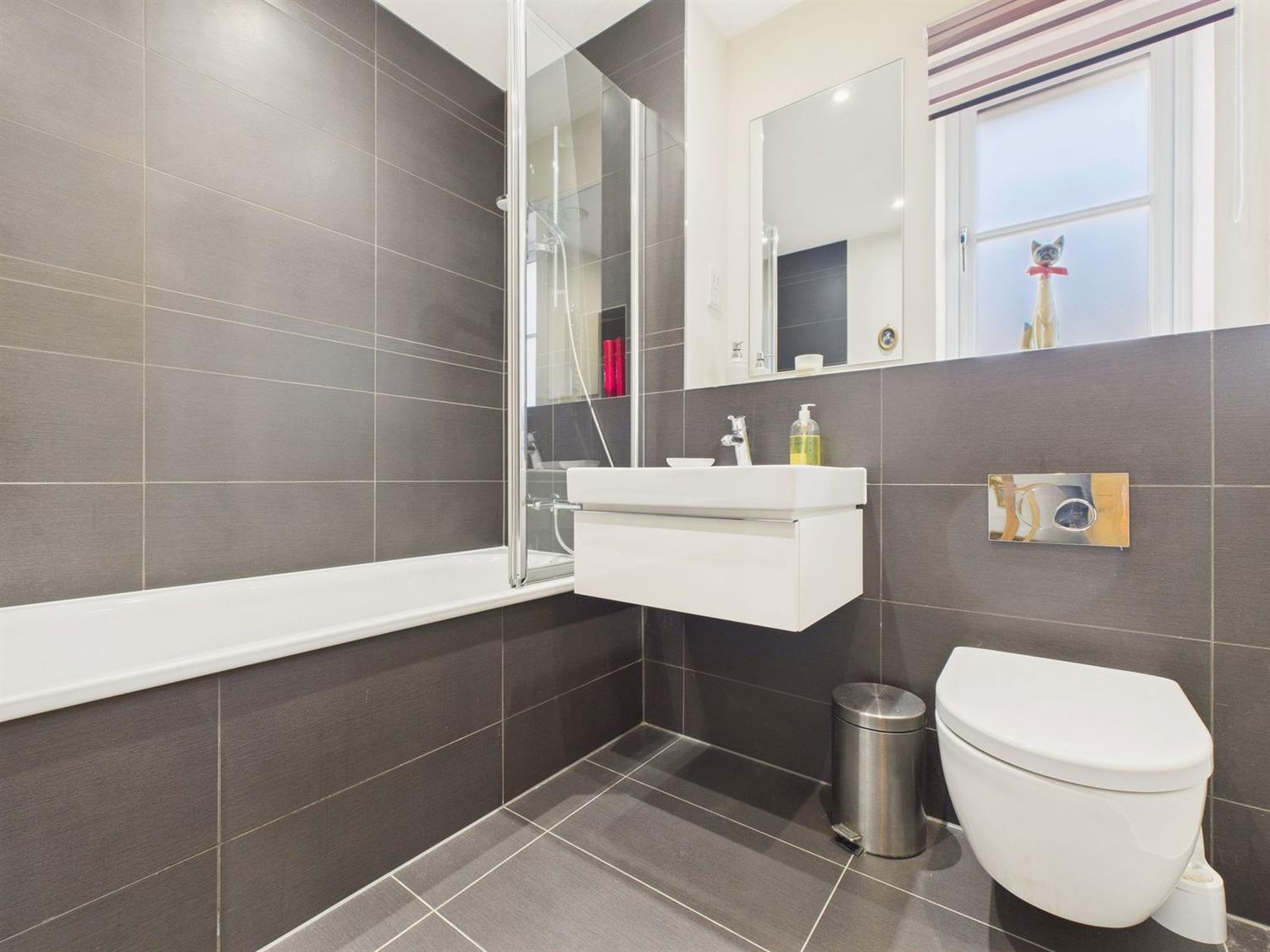 Frosted double glazed side aspect. Fitted with a white suite comprising a tile-panelled bath with chromium thermostatic shower control, wall bracket and hand shower, vanity shelf, wall mounted wash hand basin with chromium mixer tap, pull out drawer under, back to wall WC with dual flush, chromium towel warmer, localised tiling, ceramic tiled flooring.
