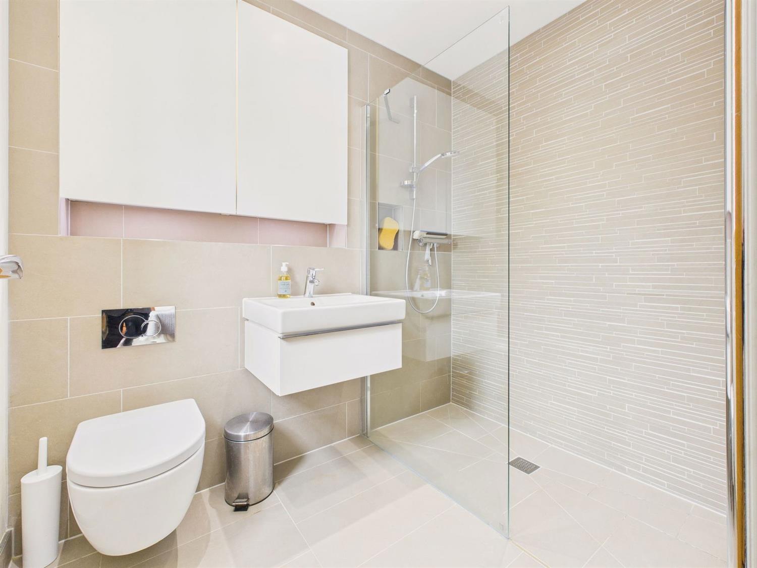 With frosted double glazed front aspect, walk in shower with glass screen, chromium thermostatic mixer control, wall bracket and hand shower, vanity shelf with inset double width cabinet, back to wall WC with chromium dual flush, wall mounted wash hand basin with chromium mixer tap and pull-out drawer, chromium towel warmer, fully tiled walls and flooring, extractor fan, radiator.