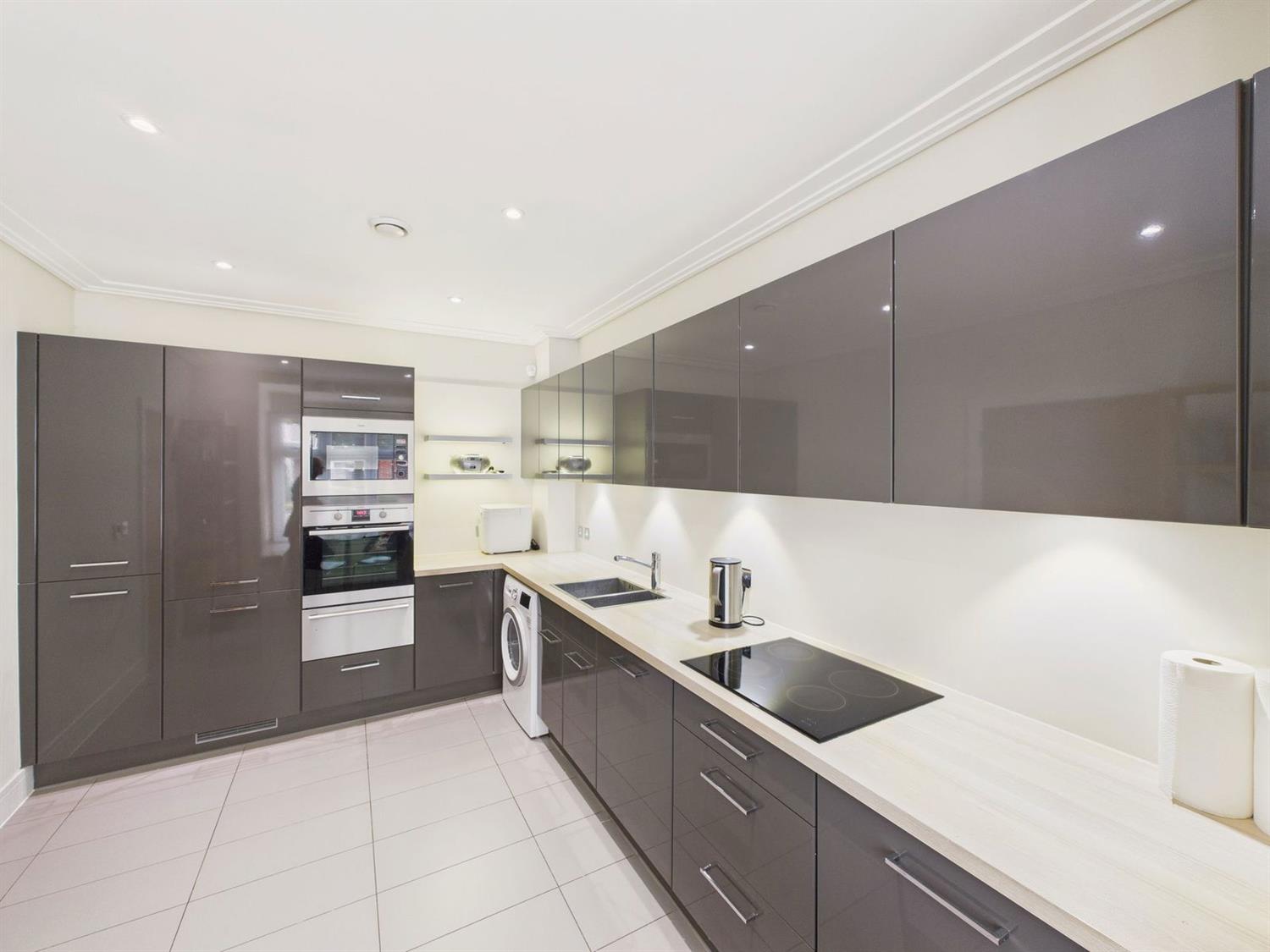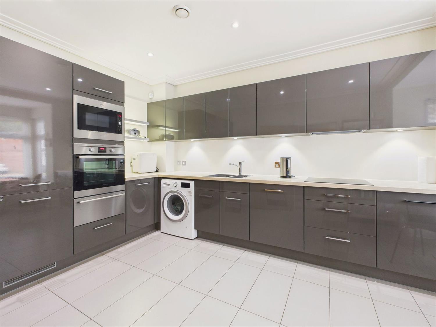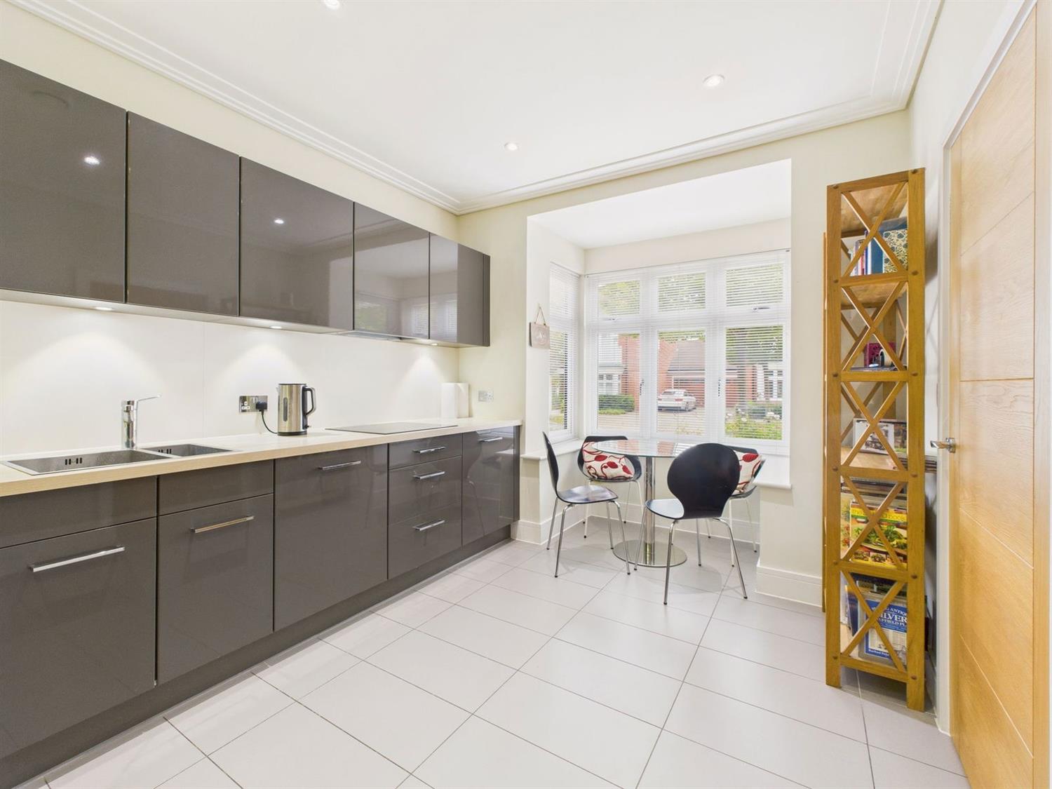 Double glazed bay front aspect. Fitted with a range of base and wall mounted cupboards and drawers in high gloss grey finish with complementing worktop surfaces incorporating a stainless steel 1 ½ bowl sink with chromium monobloc tap, AEG touch control electric hob with concealed filter over, AEG competence electric fan oven and Micromate microwave, proving drawer, Blomberg 50/50 fridge/freezer, plumbing for a washing machine, Electrolux dishwasher, TV point, LED pelmet lighting.