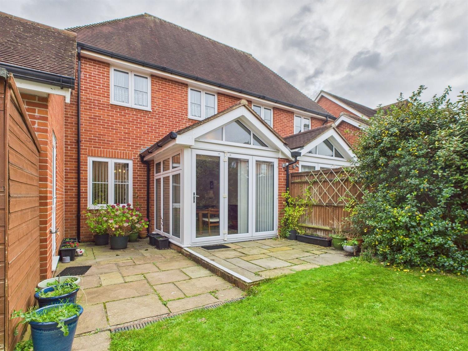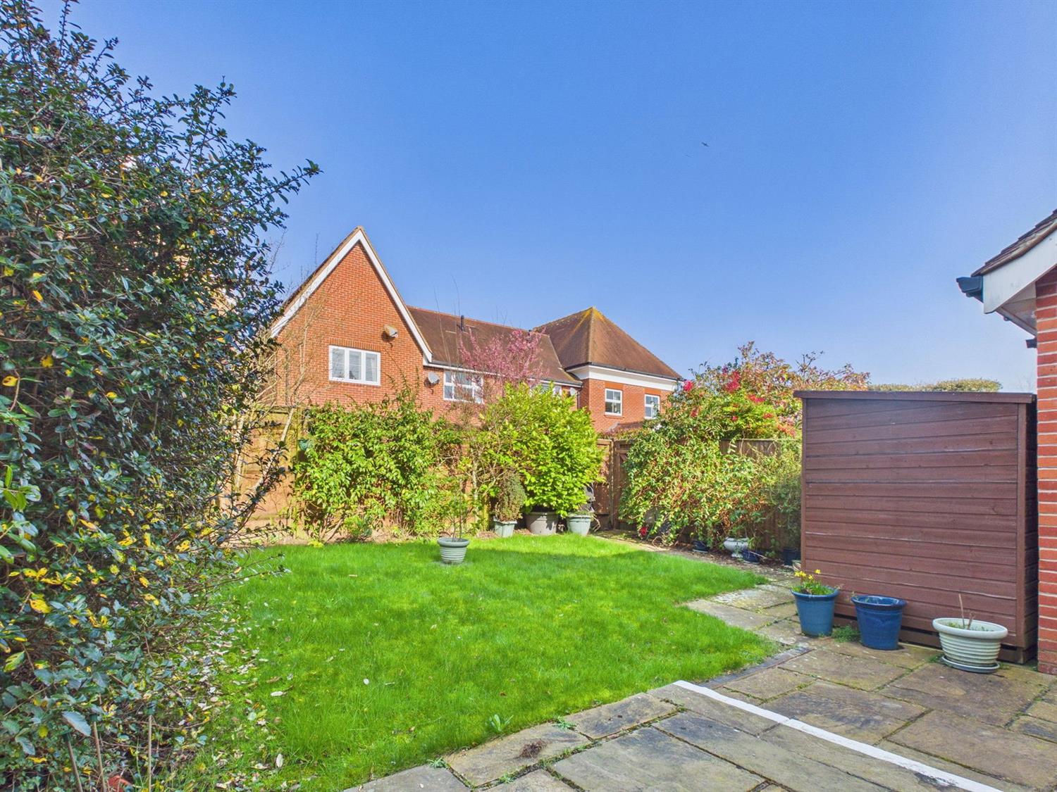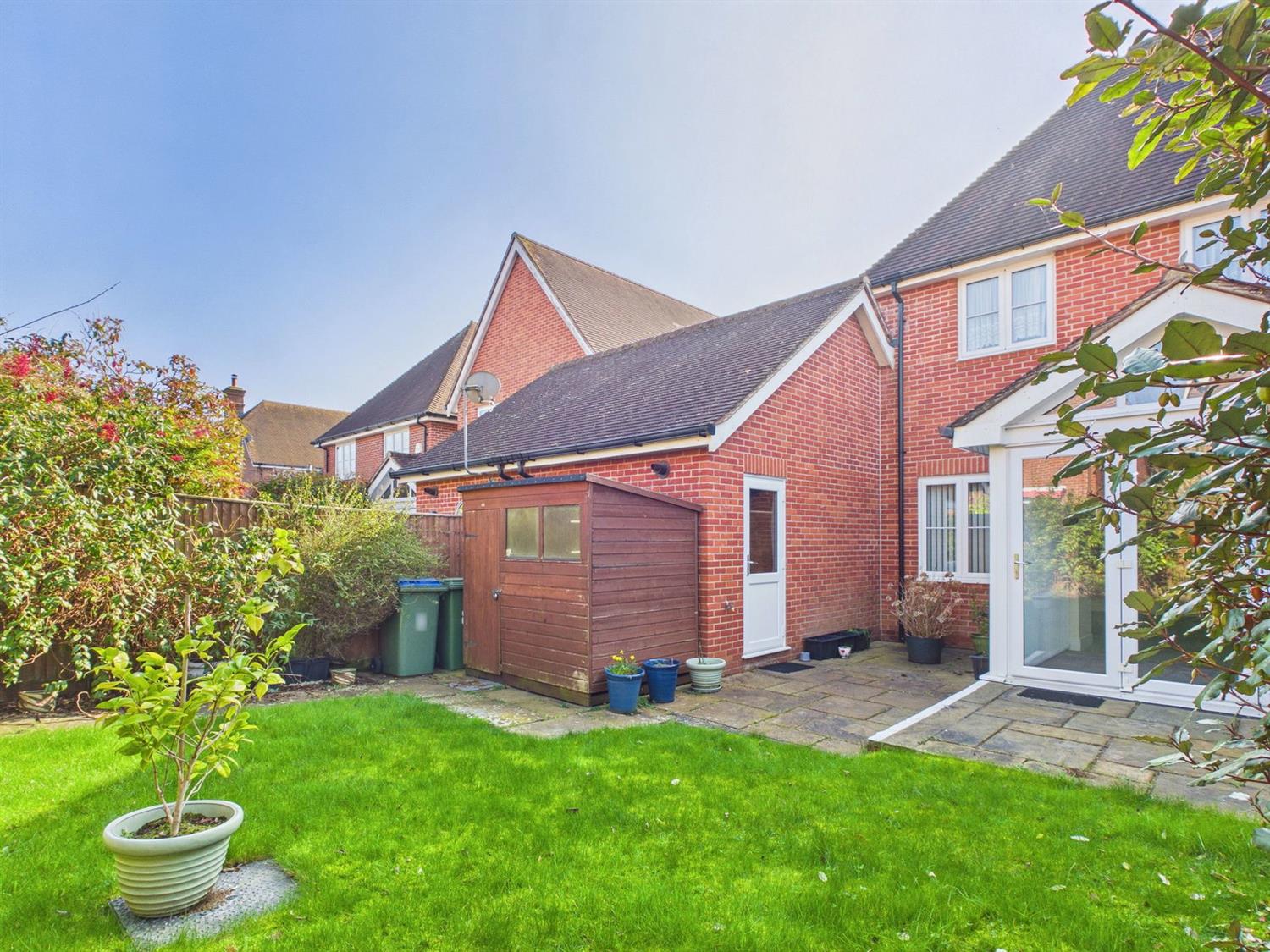 The rear garden is an enclosed space with paved courtyard and patio, area of lawn with shrub borders and a timber shed.