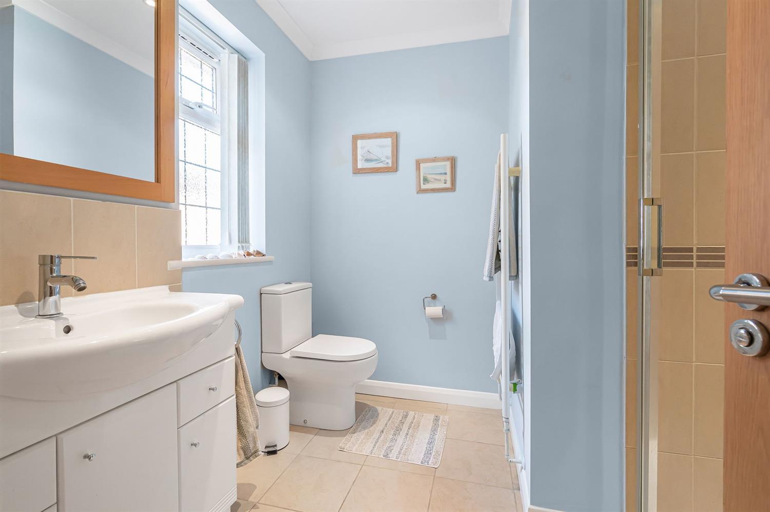 Shower Room With an oversized shower enclosure with glazed pivot door and chrome thermostatic shower, low level WC, wash basin with mixer tap and cupboards and drawers below, obscured leaded style window to the front, towel warmer, cupboard with some shelving, tiled floor, partly tiled walls, spotlights and extractor fan.