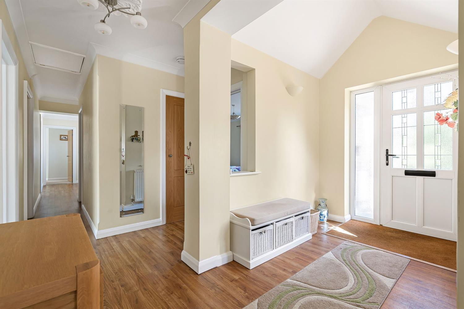 Entrance Hall Leaded effect side window, fitted doormat, wood effect LVT floor, pull down hatch providing access to the large and useful loft space. Agents Note: It is the authors belief that this area could be utilised for further accommodation subject to necessary planning permissions and approvals being obtained. Radiator, cloaks cupboard with hanging rail and shelf, thermostat for heating control, programmer for heating and hot water, attractive veneered wooden doors with wooden door furniture lead to each room.