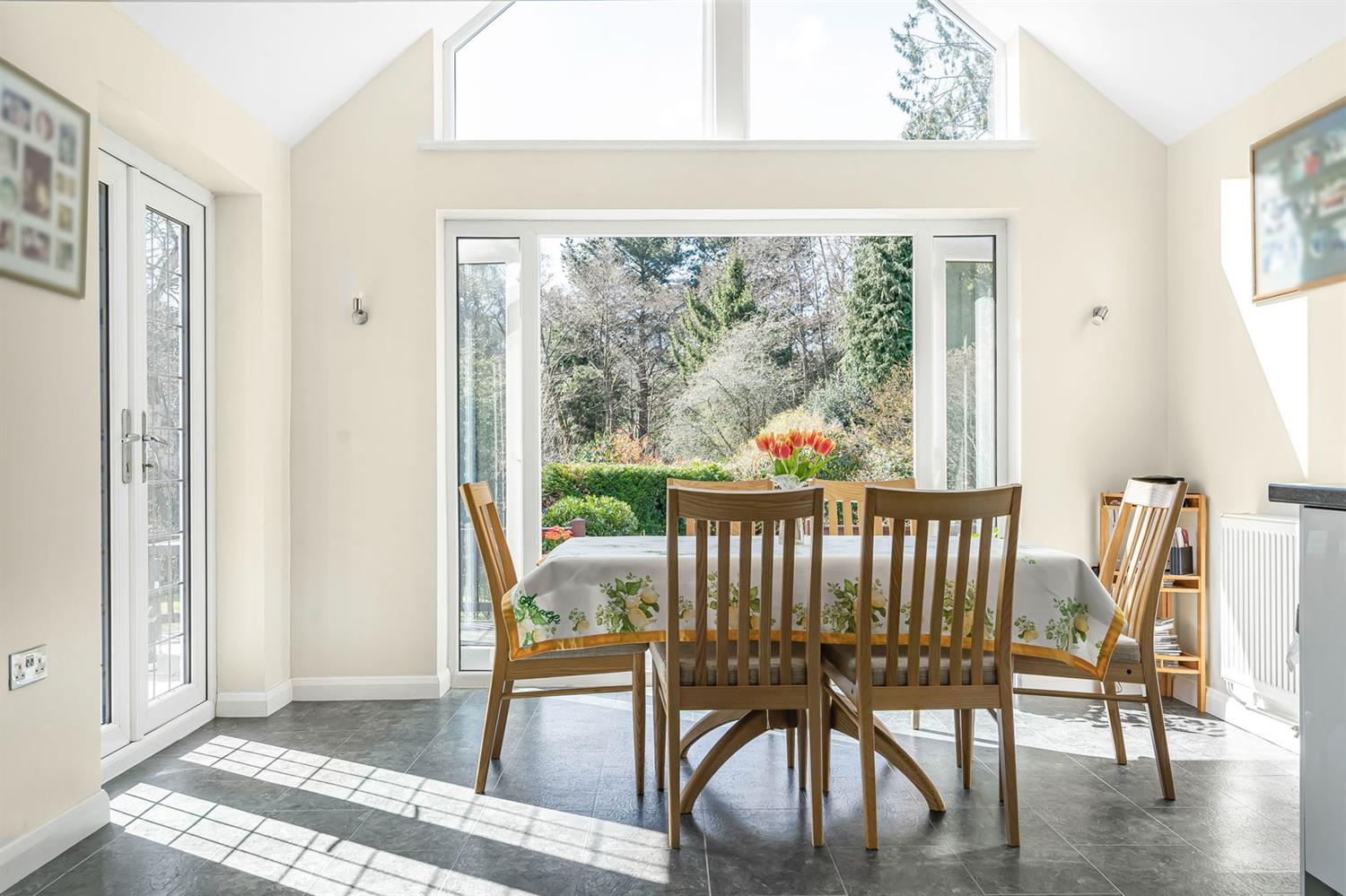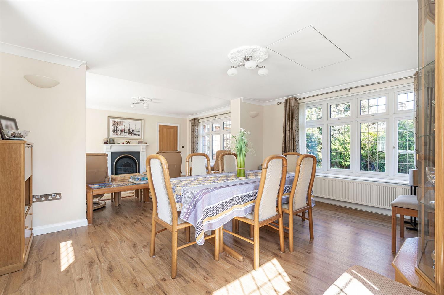 Dining Room With continuation of the wood effect LVT flooring, this triple aspect room has leaded effect windows to the front, side and rear, really embracing the attractive wooded outlook beyond, two radiators, pull down hatch with fitted wooden ladder providing access to an additional area of loft space, two wall light points, coving, TV aerial point.