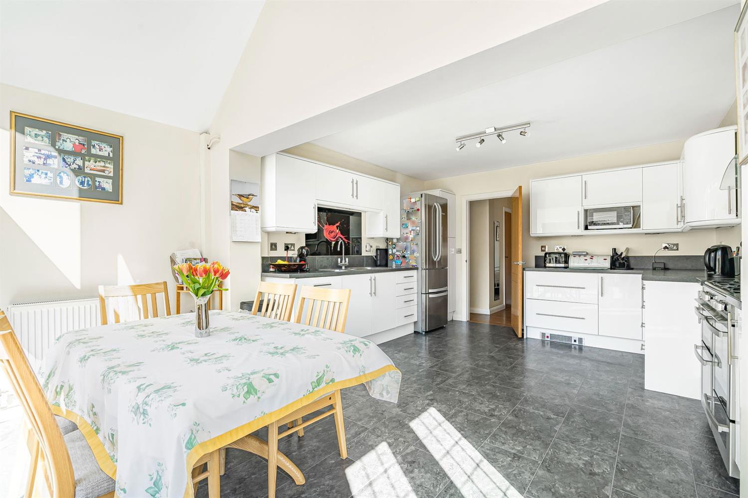 Kitchen/Breakfast Room This stunning room is bright and spacious with a seating area in a partly vaulted extension which has high level double glazing and two sets of French doors which lead out to the raised terrace. The kitchen itself is fitted in a white easy to clean range of eye and base level storage cupboards with nests of drawers, pan drawers, and with contrasting worktops with tiled upstands, large recess for range cooker with glass and stainless steel chimney style filter hood above and cupboards to each side, recess for fridge/freezer, double sink unit with mixer tap and glass splashback above, built in Bosch dishwasher, LVT floor, radiator, two wall light points, halogen counter top lighting and spotlight rail.