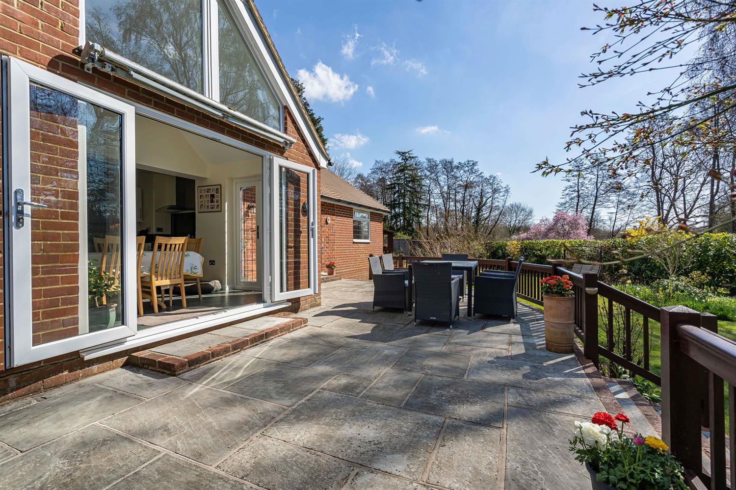 South Facing Rear Garden The rear garden is an absolute delight and it’s hard to believe you are so close to the town. Predominantly laid to lawn, the garden enjoys an enormous degree of privacy and there are large flower beds and numerous interesting areas of planting. A brick edged Indian sandstone pathway leads to steps which rise up to a terrace with balustrade and also with further steps leading down to the lawn and there is an additional rear paved area leading to the raised deck adjacent to the principal bedroom. There are attractive stone edged planting areas, a further timber shed, lovely rhododendrons and other interesting specimens and then finally at the rear most part there is a further metal shed and a gate which leads to a lovely hidden away naturalistic river bank with the river running through. The whole garden benefits from the seclusion that the margin of the river provides and really needs to be seen to be appreciated.