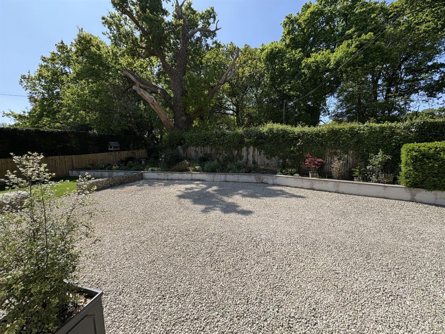 From Broadwater Lane, vehicular access leads to twin wooden gates which open up to a wide drive laid to Cotswold stone chippings and providing hard standing for a number of cars. There is a wall mounted