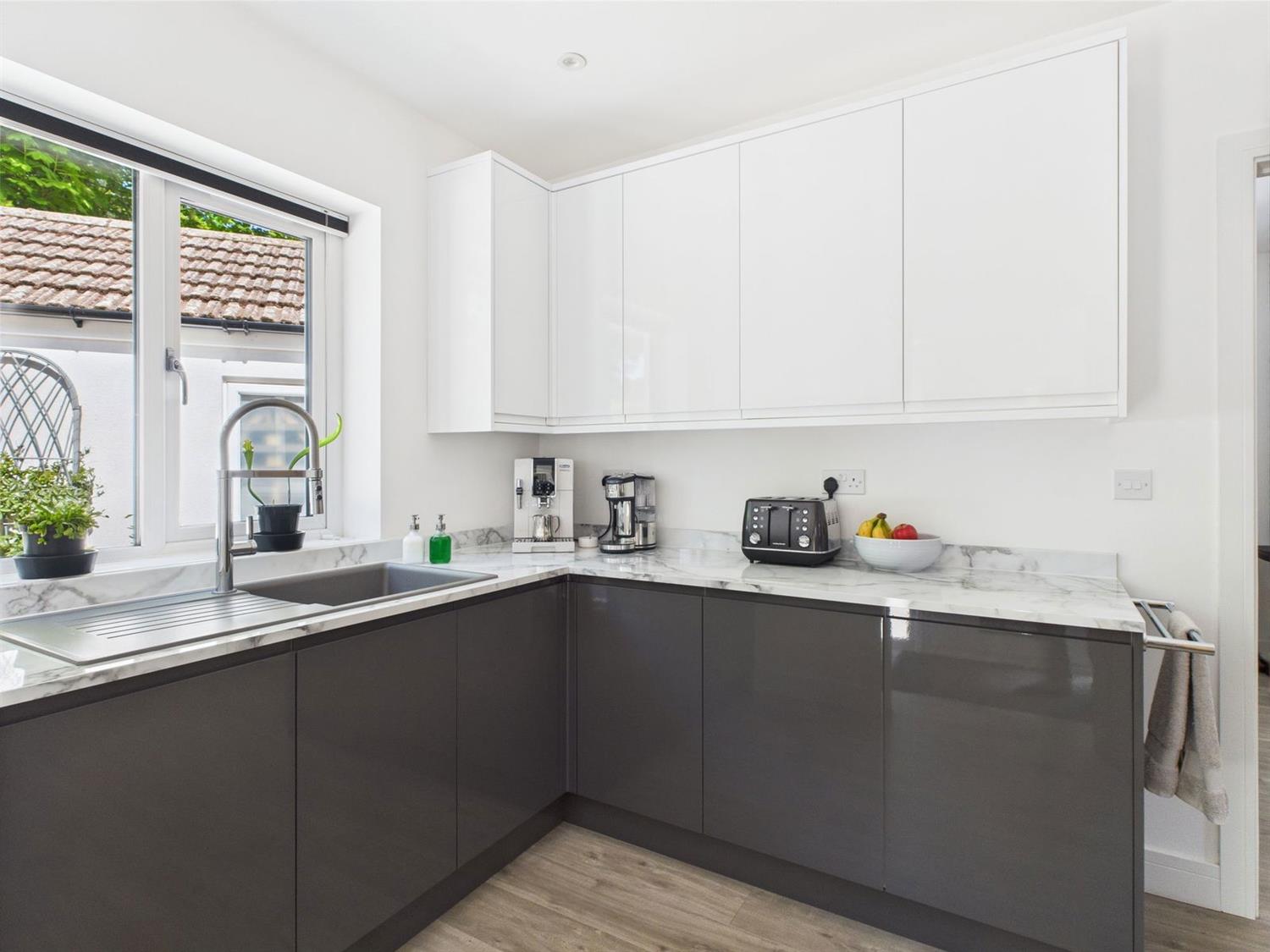 Side aspect. Two-tone range of base and wall mounted cupboards and drawers in white and grey high gloss finish, complementing marble effect worktop surfaces incorporating Lamona grey inset sink with drainer, chromium monobloc tap with flexi-hose, integrated Lamona dishwasher, radiator, downlighting.