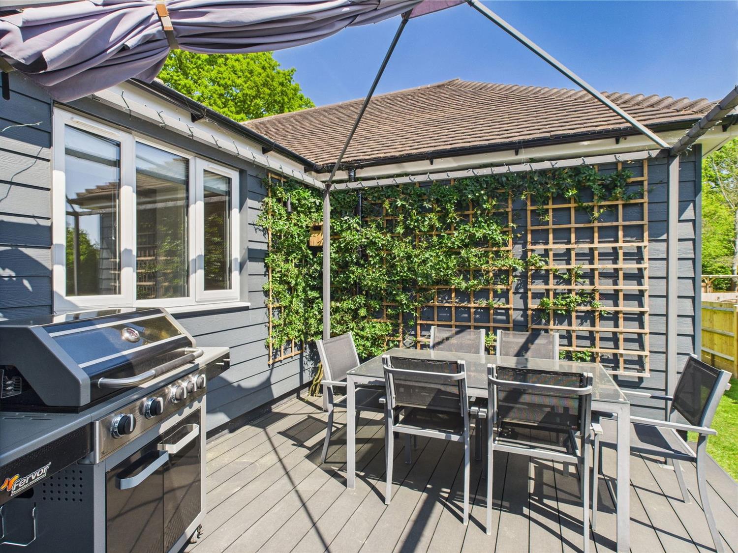 sheltered sun terrace having composite decking and trellis work with maturing passion flower. Two radiators.