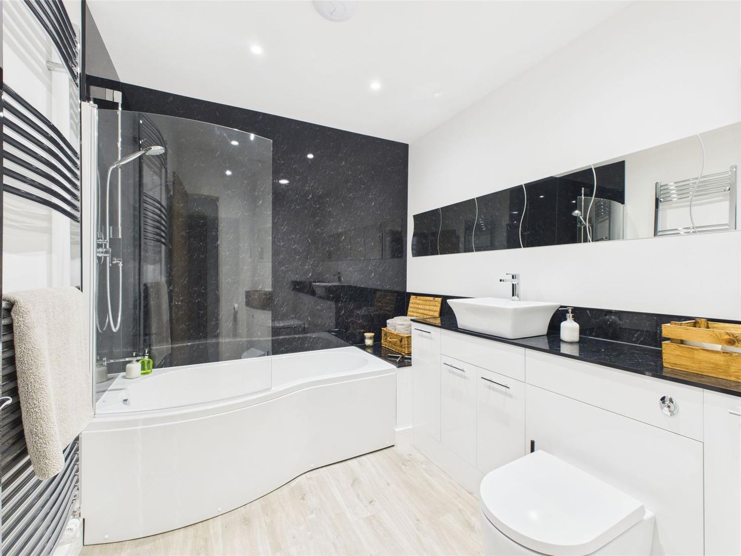Luxury Family Bathroom Fitted with a white suite comprising panelled P-shaped bath with Asquith chromium thermostatic shower control, wall bracket and hand shower, chromium filler and drainer, glass screen, black marble effect panelled wall and vanity top with cupboards under, white rectangular wash hand basin with chromium mixer tap, back to wall WC with concealed cistern and chromium dual flush, chromium towel warmer, shaver point, designer mirror tiles, extractor fan and downlighting.