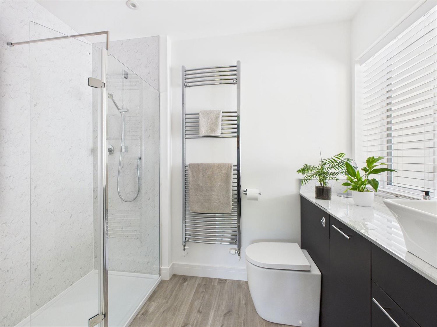 Frosted side aspect, oversized shower cubicle with glass screen, marble effect panelled walls, chromium thermostatic shower control, wall bracket and hand shower, chromium towel warmer, vanity unit with marble effect top and cupboards under, rectangular wash hand basin with chromium mixer tap, back to wall WC with concealed cistern and chromium dual flush, designer mirror tiles.