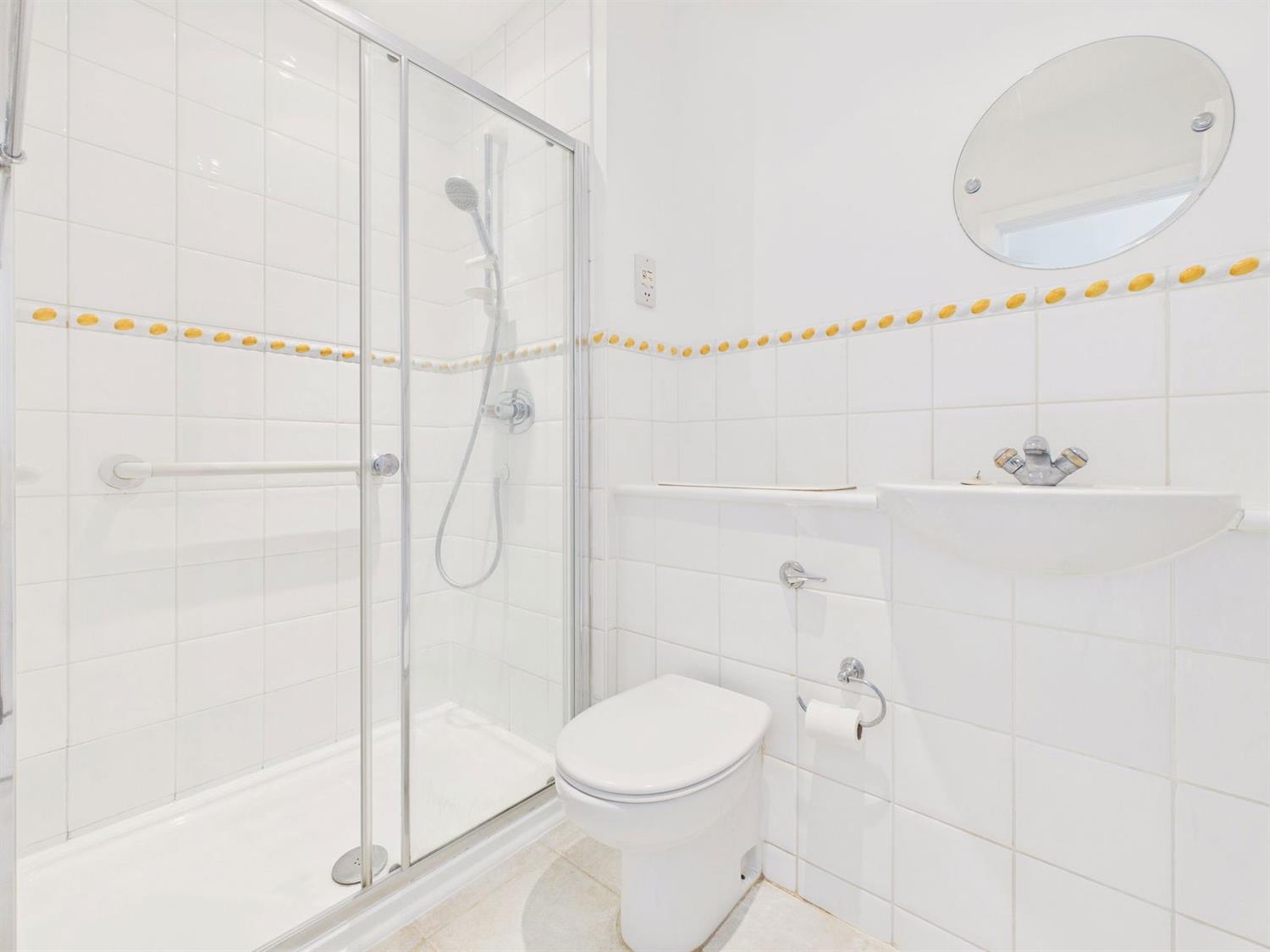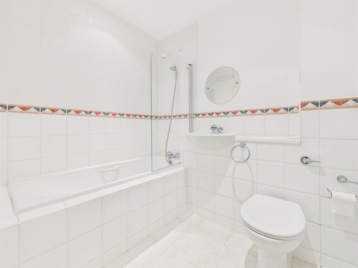 Fitted white suite comprising panelled bath with mixer tap and shower attachment, glass shower screen, vanity unit with inset wash hand basin, back to wall w.c., shaver point, extractor fan, half tiled walls, radiator, ceramic tiled flooring.