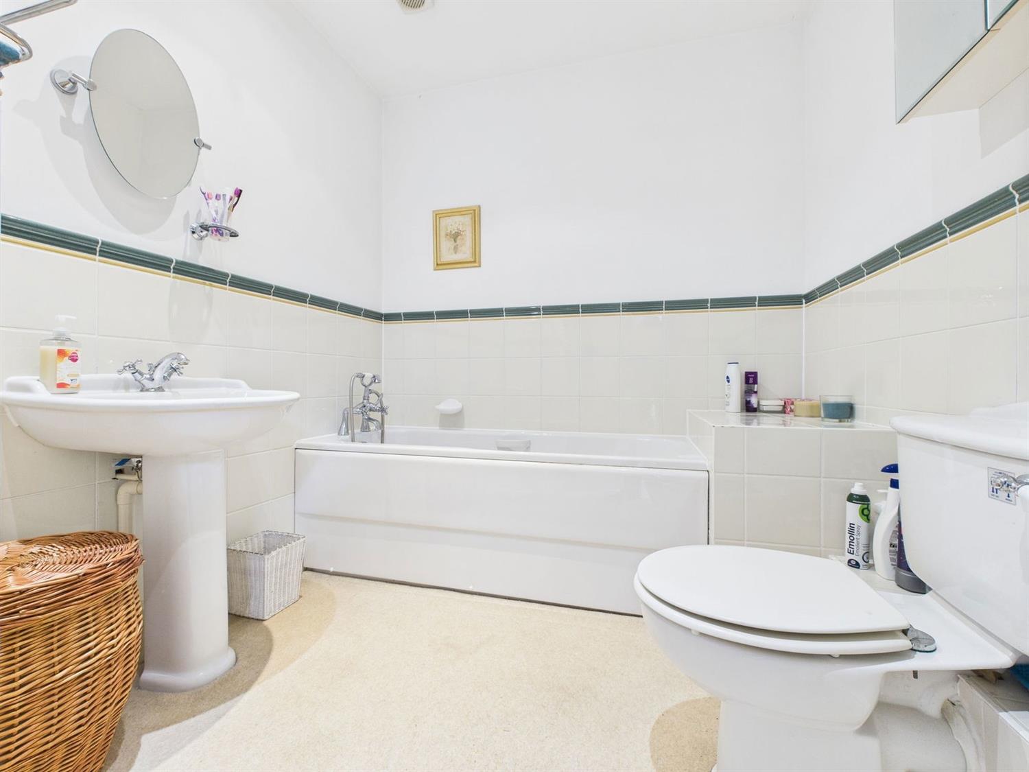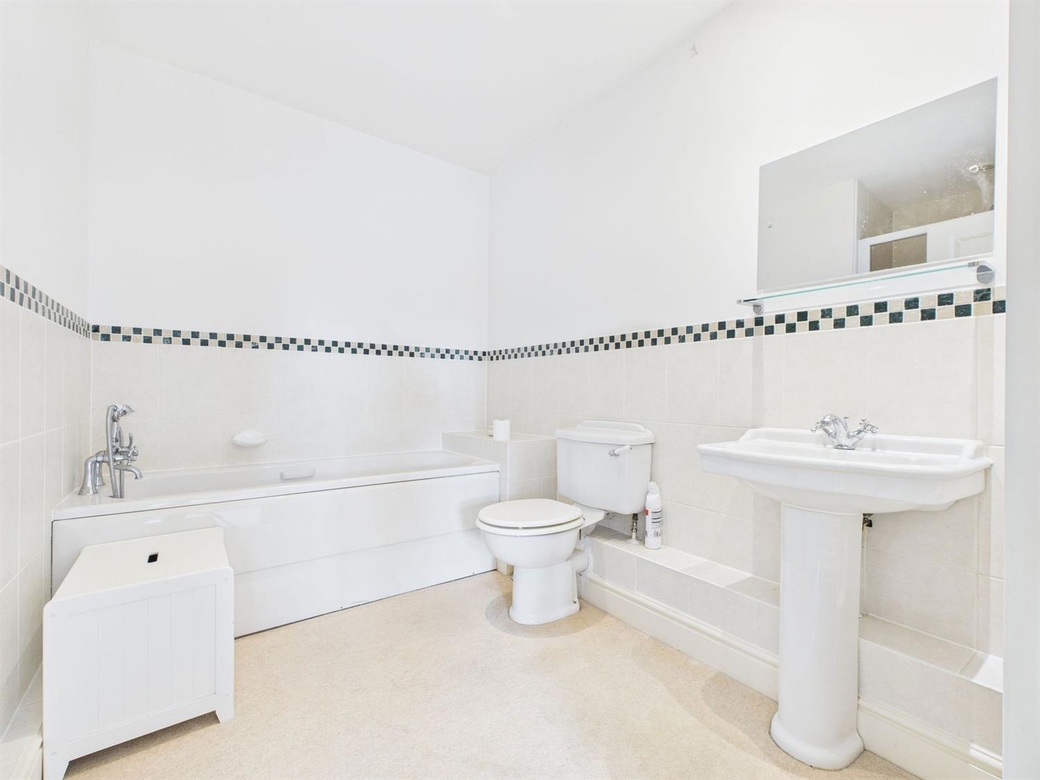 BathroomFitted with a white suite comprising a panelled bath with chromium mixer tap and shower attachment, low level wc., pedestal wash hand basin with chromium mixer tap, white towel warmer, half tiled walls, downlighting, loft hatch.