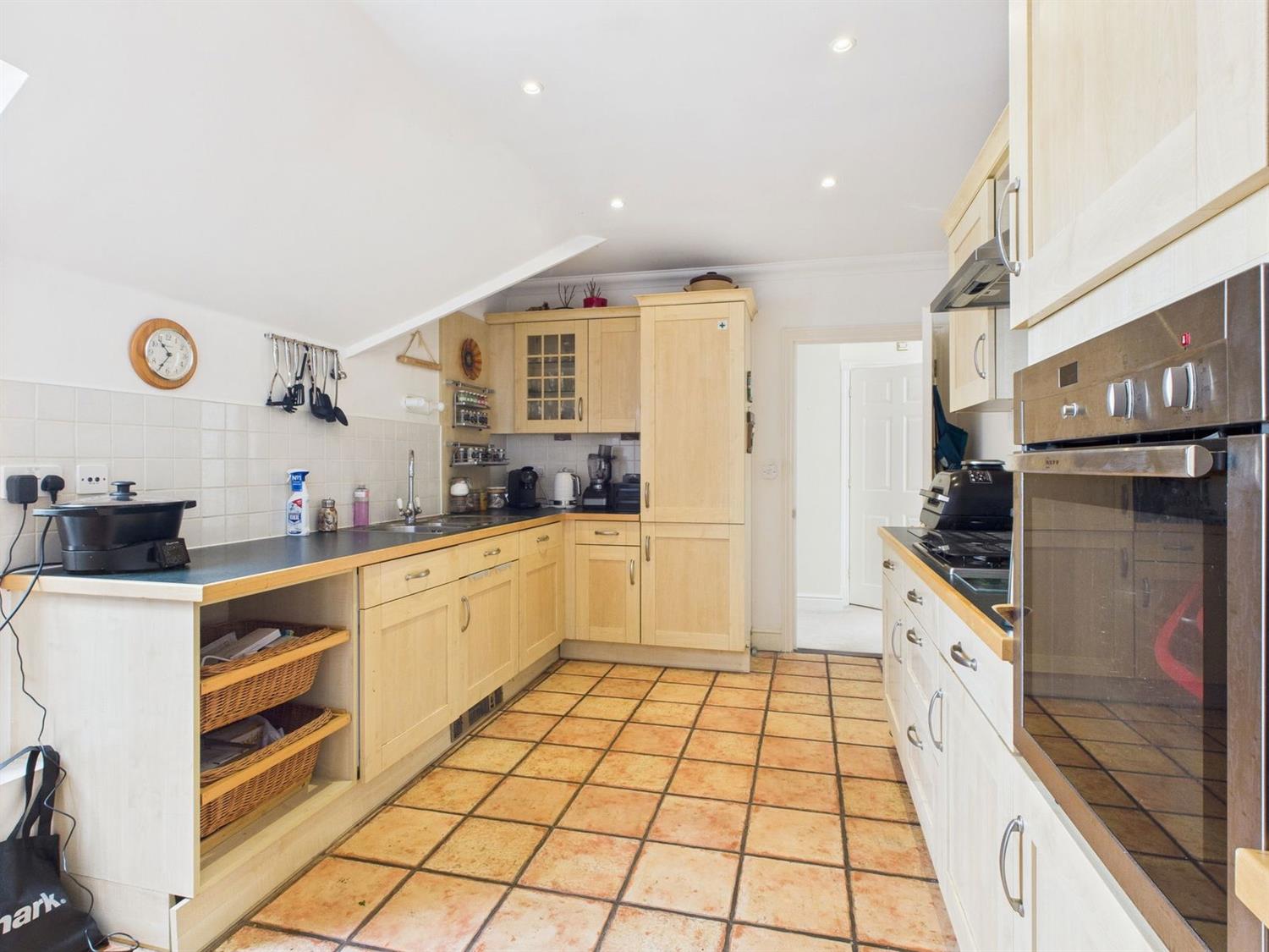 Kitchen / Breakfast RoomDouble glazed sky light. Fitted with a range of base and wall mounted cupboards and drawers in light wood, with complimenting work top surfaces incorporating a one and a half bowl single drainer stainless steel sink with chromium monobloc tap, stainless steel four ring gas hob, Siemens stainless steel filter hood over, Neff eye level oven, Siemens washing machine, Bosch dishwasher and Siemens fridge/freezer, ceramic tiled splashbacks, tv/fm point, pelmet lights, terracotta tiled flooring, downlighting.