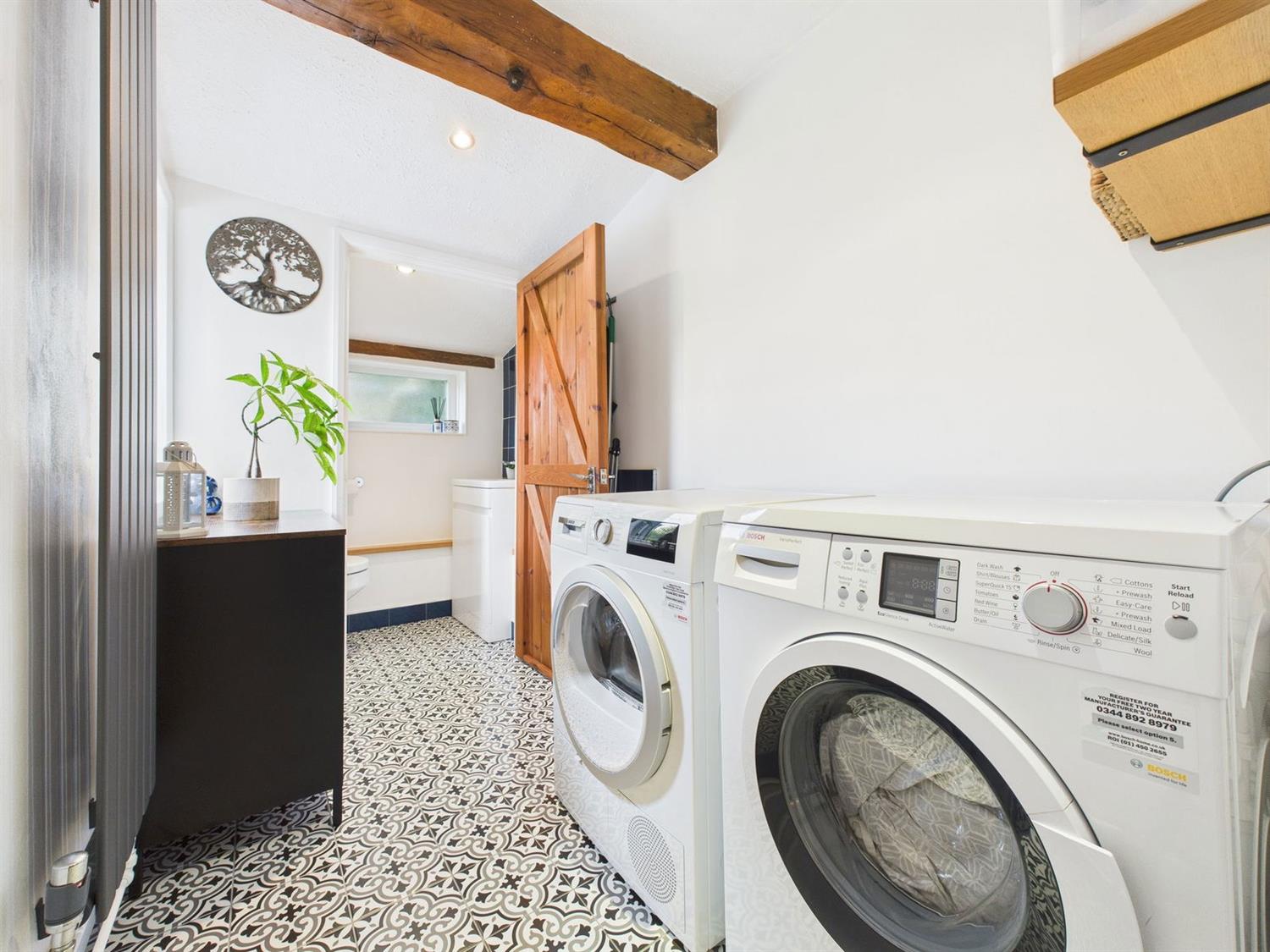 Utility Room A useful separate utility room with space and plumbing for washing machine, space for tumble dryer, shelving, vertical radiator, side aspect window, tiled floor, downlighting, door to cloakroom.