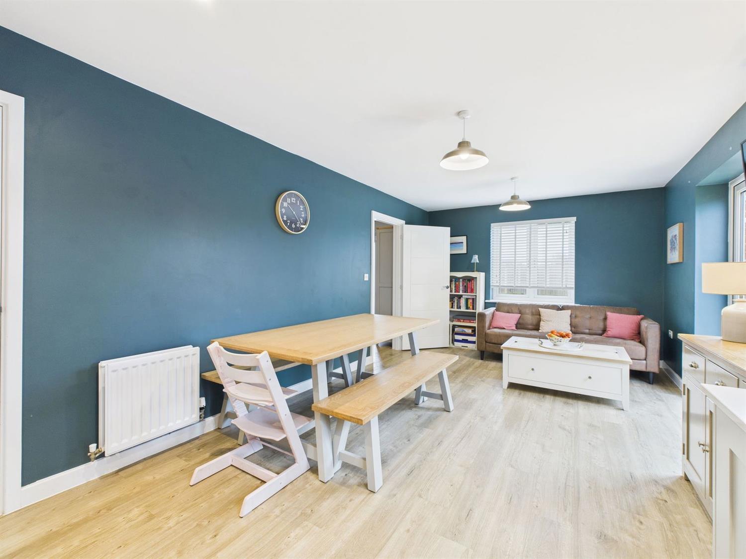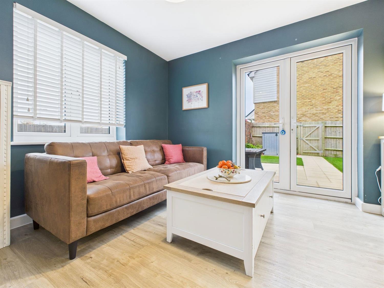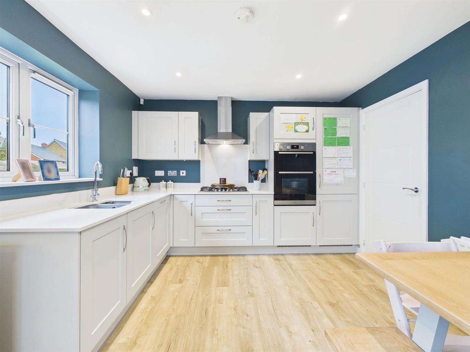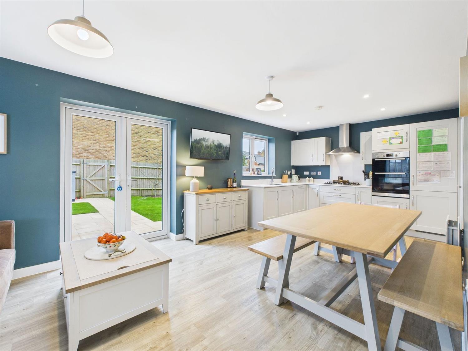 Kitchen/Dining/Family RoomAn impressive open-plan space with a continuation of LVT flooring, front and side aspect windows, and French doors opening onto the rear garden.