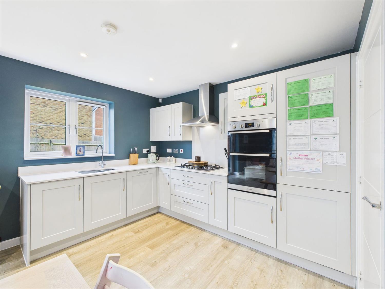 The high specification kitchen is fitted with a contemporary range of warm grey eye and base level cabinets and drawers with complementing quartz worktops, inset one and a half bowl stainless steel sink with worktop routed drainer and mixer tap, five-burner gas hob with extractor hood above, integrated eye-level double electric oven, integrated fridge/freezer, integrated dishwasher, downlighting, radiator, and a door leading to the utility room.