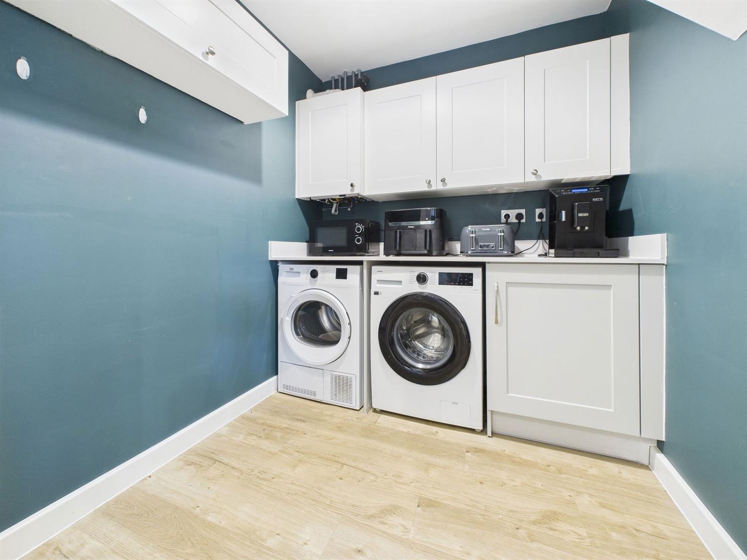 Utility RoomA useful separate utility space with matching cabinetry and worktops providing space and plumbing for a washing machine and tumble dryer. There is a wall-mounted gas-fired boiler, high-level storage cabinet with display shelving, radiator, and a door to an understairs storage cupboard.