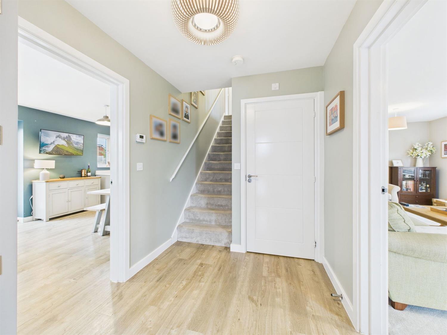 Entrance HallA welcoming entrance hall with LVT flooring, radiator, and wall-mounted thermostat control, stairs rising to the first-floor landing, doors leading to the cloakroom, kitchen/dining/family room, and sitting room.