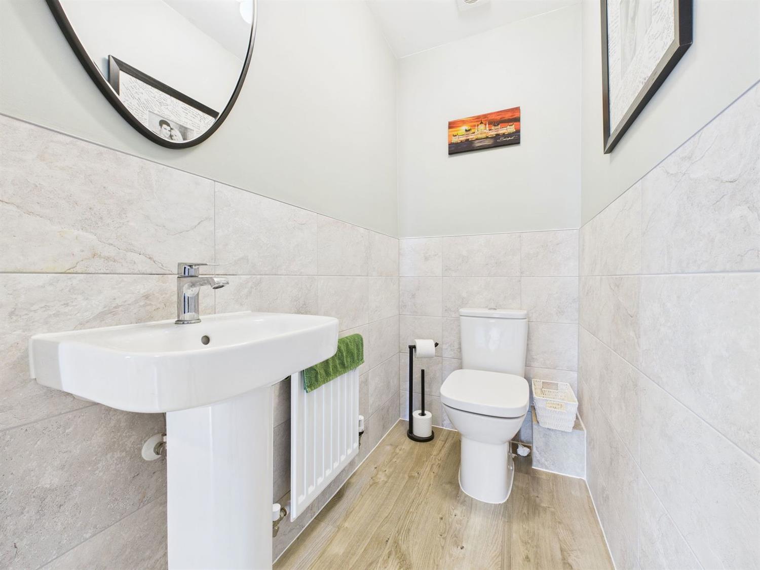 CloakroomFitted with a low-level WC with dual flush, pedestal wash hand basin with mixer tap, radiator, half-height wall tiling, and LVT flooring.