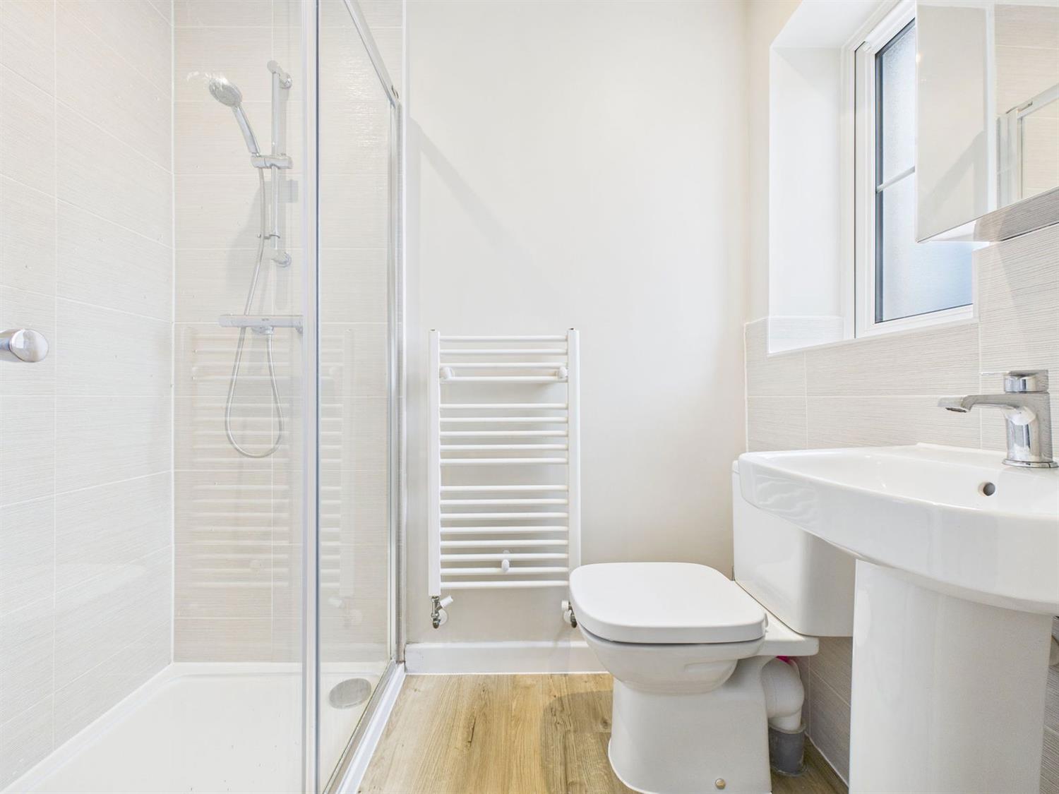 Ensuite Shower RoomA stylish shower suite comprising an oversized walk-in shower with shower mixer and shower attachment, low-level WC with dual flush, pedestal wash hand basin with mixer tap, mirrored cabinet, shaver point, heated towel radiator, obscured front aspect window, downlighting, extractor fan, and LVT flooring.
