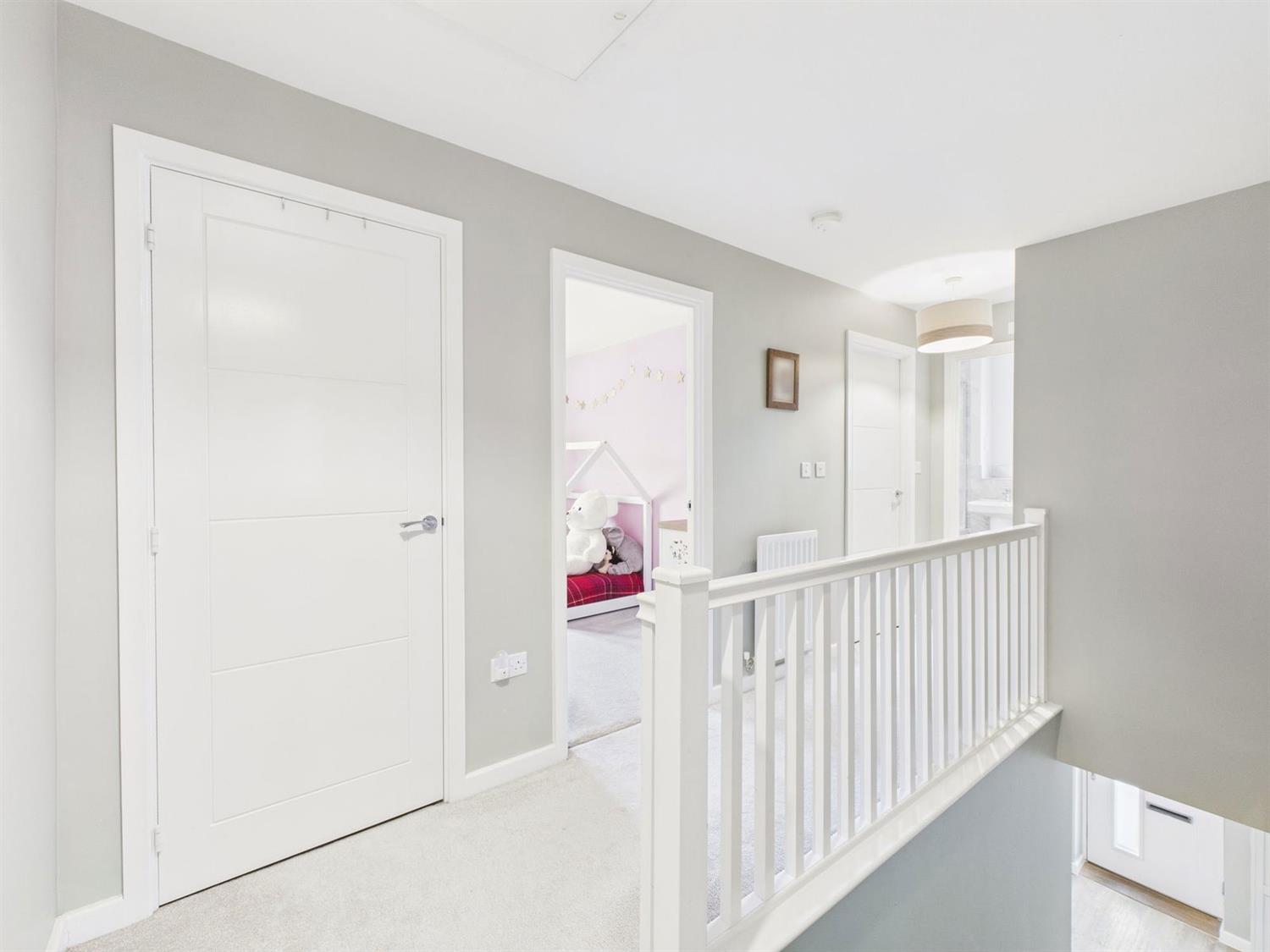 first floor landing, which has a large storage cupboard with shelving and hanging space. There is a radiator, loft hatch, and doors to all rooms.