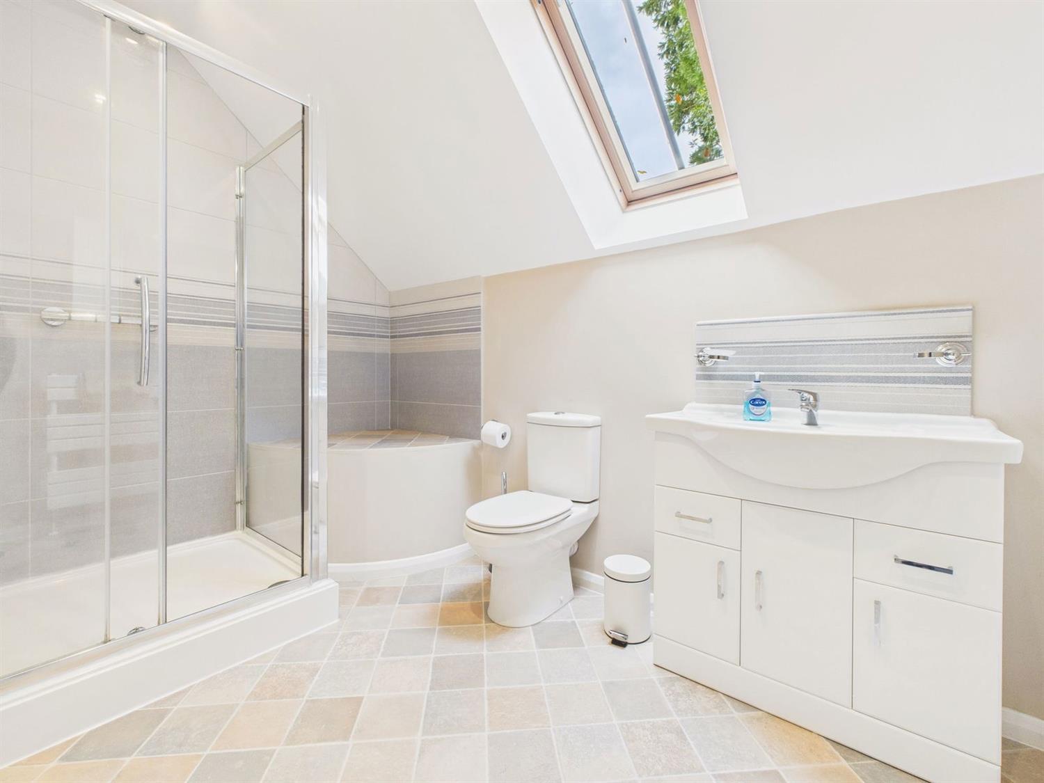 A very generous space and fitted with a luxury white suite of an over-sized shower with chromium thermostatic shower control, wall bracket and hand shower, sliding glass door, a vanity unit with an inset wash hand basin, chromium mixer tap, cupboard under, mirrored cabinet, splashback, low level w.c., radiator, attractive sloping ceiling with double glazed Velux-style roof window, spot lighting, extractor fan, shaver point. emergency pull cord.