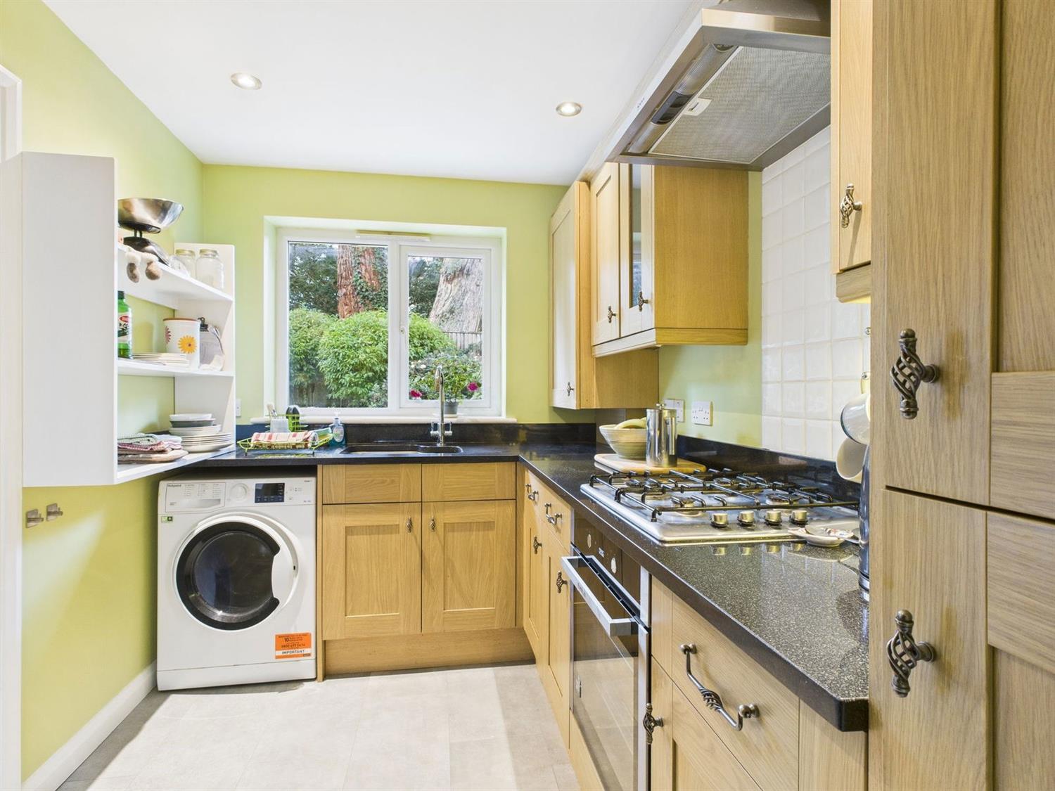 Having been very well fitted in an attractive oak style range of eye and base level storage cupboards with granite working surfaces with up-stands and with an under-hung Franke 1¼ bowl sink with chrome contemporary mixer tap, built in Blomberg electric oven with 4-burner gas hob over and with Neff canopied style filter hood and with tiled splashback, integrated fridge and freezer, cupboard disguising the Ideal gas fired boiler providing the heating and domestic hot water, counter top lighting and halogen spot lighting, radiator, emergency pull cord.