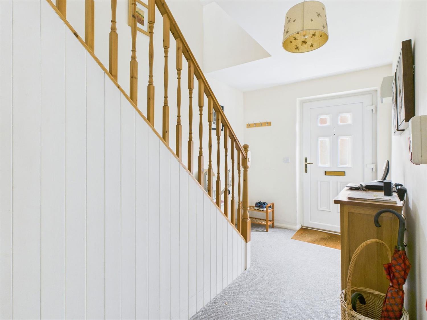 With staircase to the first floor, radiator, electricity fuse box, emergency pull cord, digital thermostat for heating control, mains smoke alarm, door to the under stairs storage cupboard, door to