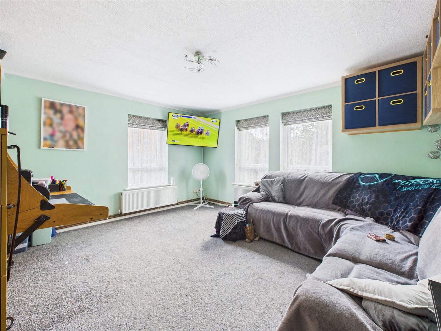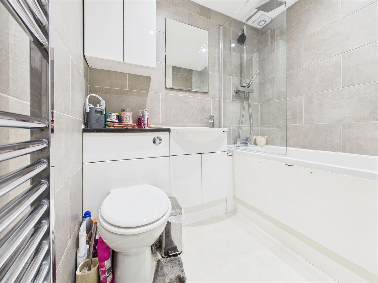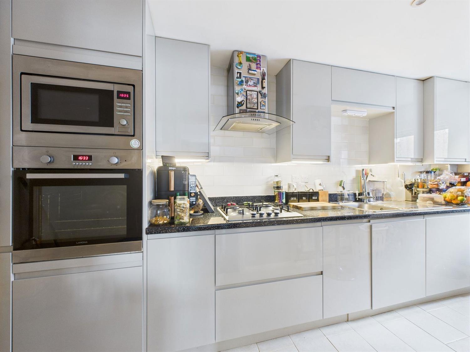 KitchenDouble glazed side aspect. Fitted with a modern range of base and wall mounted cupboards and drawers in grey high gloss finish having complementing worktop surfaces with a single drainer stainless steel sink with chromium monobloc tap, stainless steel gas hob with filter hood over, eye level stainless steel electric oven and microwave, integrated fridge/freezer, matching breakfast bar, metro style tiled splashback, ceramic tiled flooring, downlighting and pelmet lights, radiator, overhead storage unit.