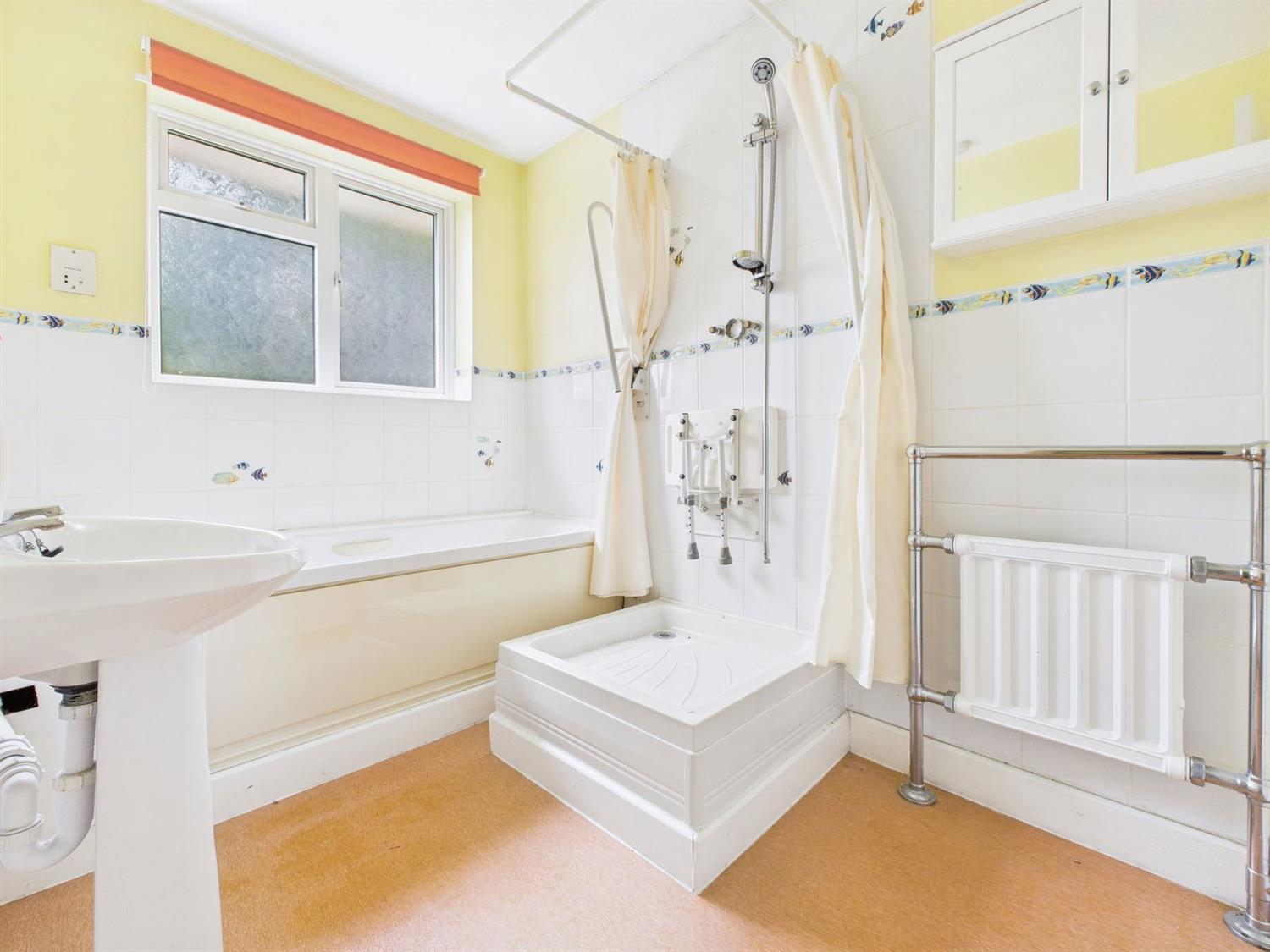BathroomFitted with an enclosed panelled bath, pedestal wash hand basin, and a separate shower enclosure. The bathroom also includes a built-in airing cupboard with shelving, radiator, half-height wall tiling, shaver point, and a front aspect obscured window.