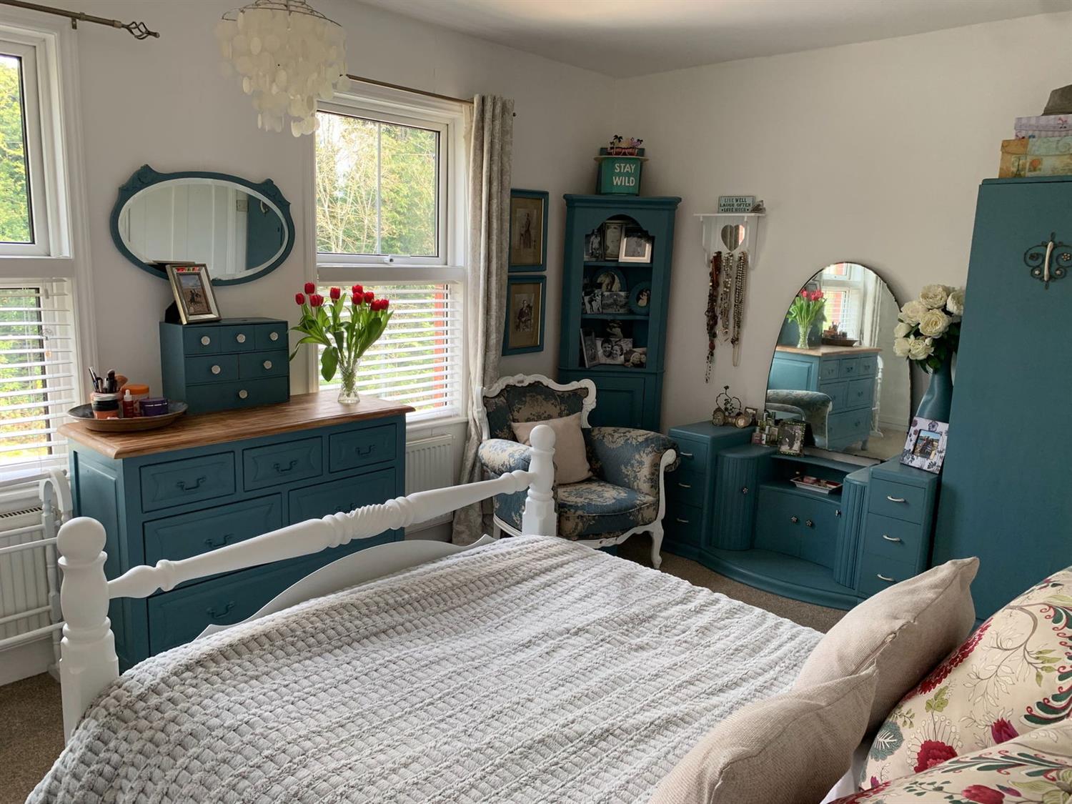 Bedroom 1Twin double glazed front aspect, cast iron fireplace with louvre fronted double width cupboards either side, two radiators.