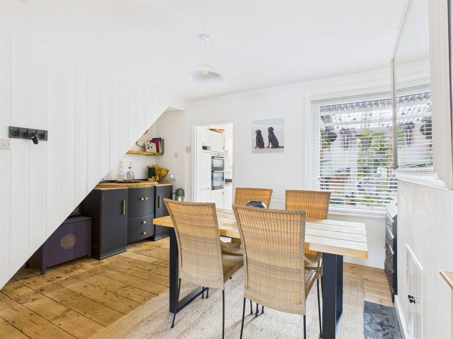 Dining RoomDouble glazed rear aspect, understairs recess with panelled walls, chimney breast with built in cupboard, wide opening to