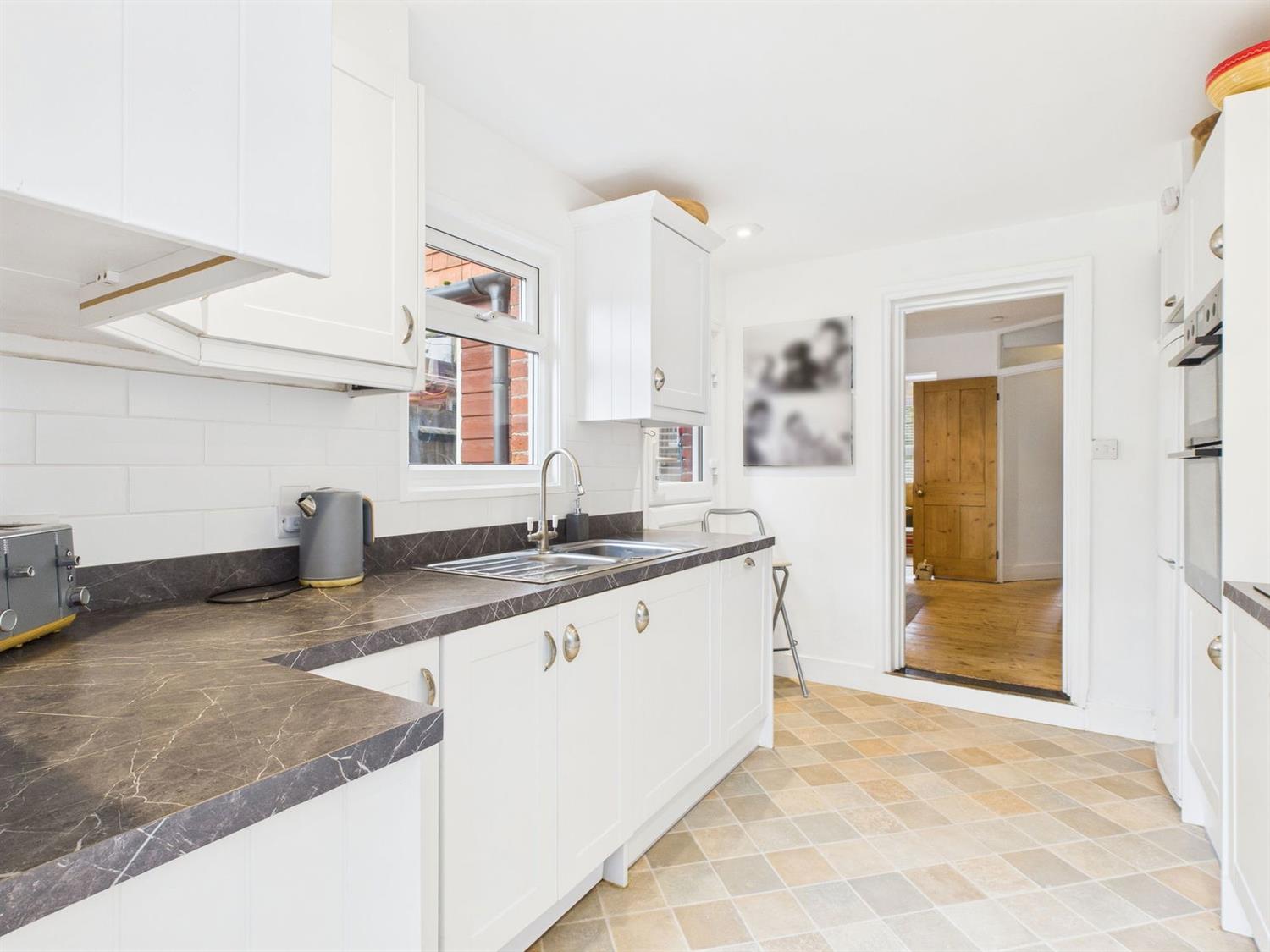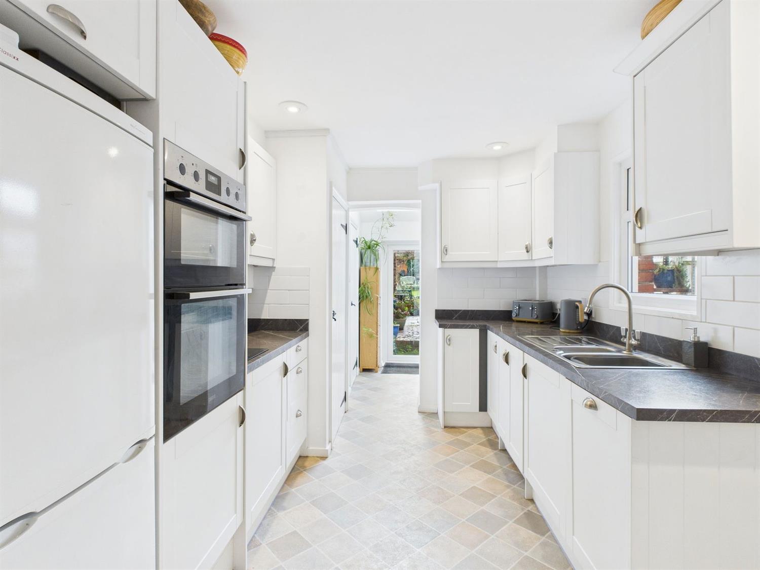 KitchenA stylish modern kitchen offering underfloor heating, a larder cupboard and fitted with a range of base and wall mounted cupboards and drawers in white shaker style having complementing Quartz effect worktop surfaces incorporating a 1 1/2 bowl single drainer stainless steel sink with brushed metal monobloc tap, Limon two plate touch control hob, Zanussi eye level double oven, space for a fridge freezer, pull out recycling bin drawer, space and plumbing for a dishwasher, white metro style tiled splashback, downlighting, vinyl flooring, double glazed side aspect and double glazed stable door to the