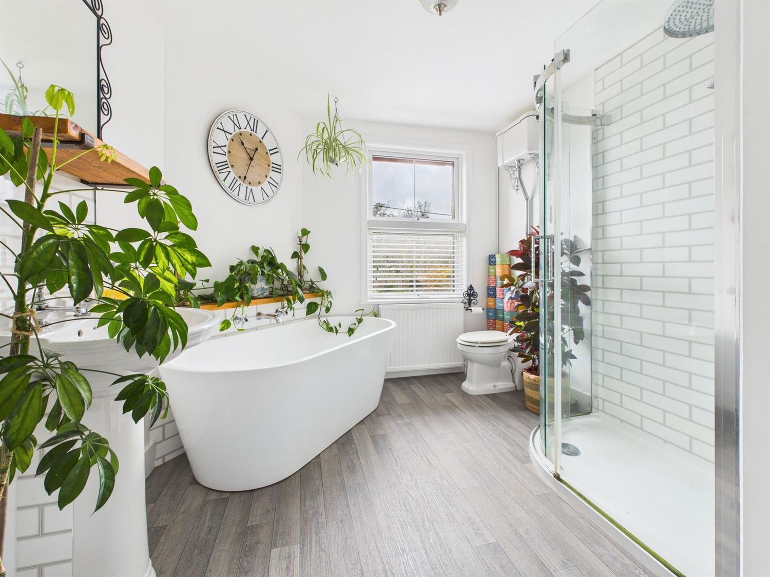Luxury Bath/Shower RoomDouble glazed rear aspect comprising double ended free standing bath having chromium taps and filler, large quadrant shower cubicle with chromium thermostatic control, wall bracket and hand shower and over head drencher unit, tile effect acrylic panels, pedestal wash hand basin with chromium mixer tap and tile effect splashback, Victorian style WC with overhead cistern, radiator, wood effect vinyl flooring, airing cupboard housing hot water cylinder and shelving.