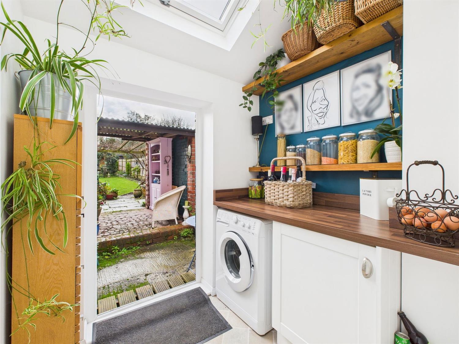 Utility area with a double glazed skylight and double glazed door to outside. Worktop surface with cupboard under, space and plumbing for washing machine, two Oak shelves, track spot lighting. Latch door to