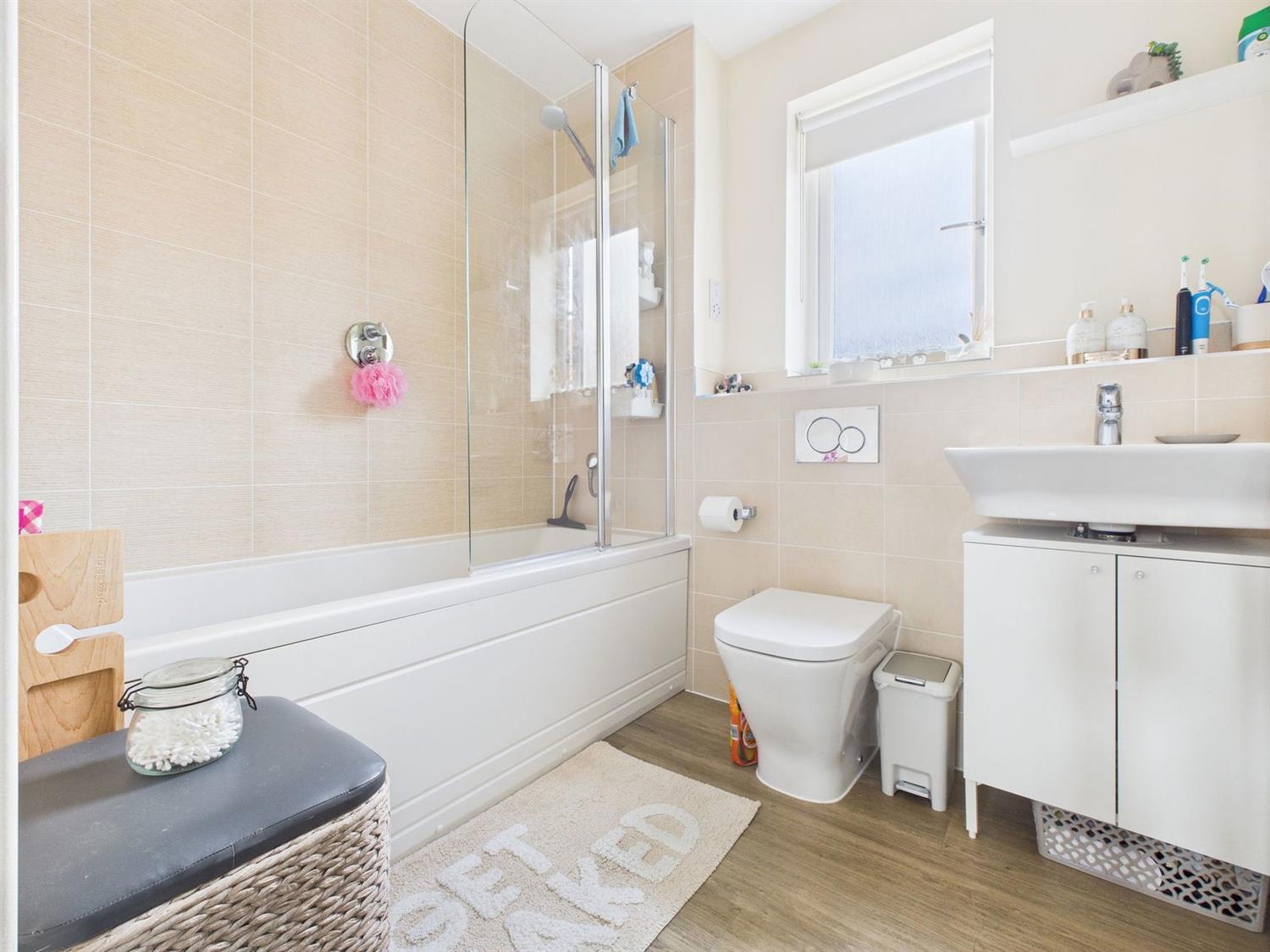 Guest BathroomFrosted double glazed rear aspect. Fitted with a white suite comprising panel bath with chromium mixer tap, wall bracket and hand shower, back-to-wall WC, wall mounted wash hand basin with chromium mixer tap, vanity shelf, localised tiling, chromium towel warmer, LVT flooring.