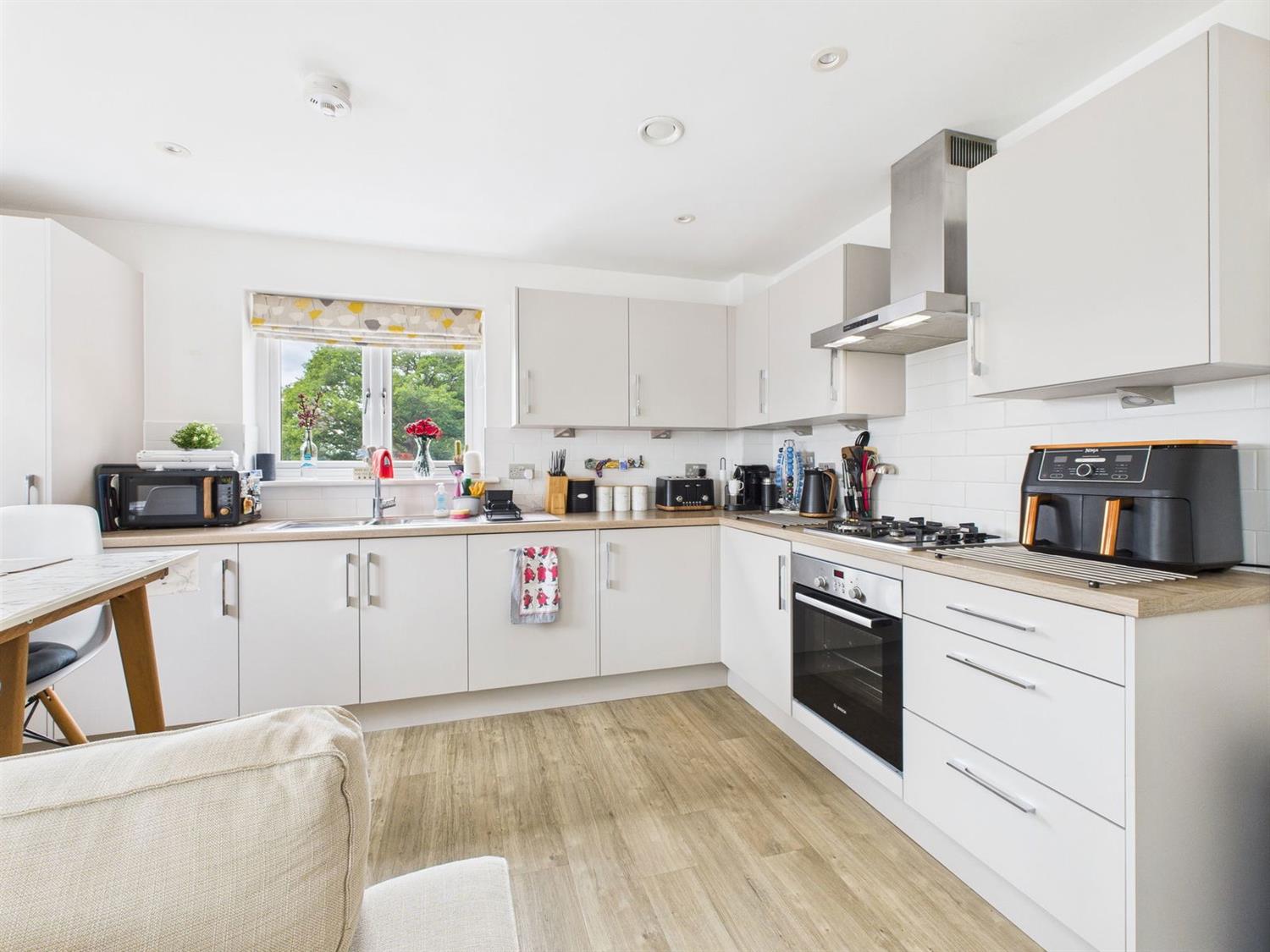 Kitchen/Living RoomDouble glazed double aspect to the front and side with French doors to the Juliet balcony. The Kitchen Area is fitted with a comprehensive range of base and wall mounted cupboards and drawers with complementing worktop surfaces incorporating a 1 1/2 bowl single drainer stainless steel sink with chromium monobloc tap, four ring gas hob with a filter hood over, electric oven, Bosch washer/dryer, integrated dishwasher and fridge/freezer, radiator, flooring and downlighting.