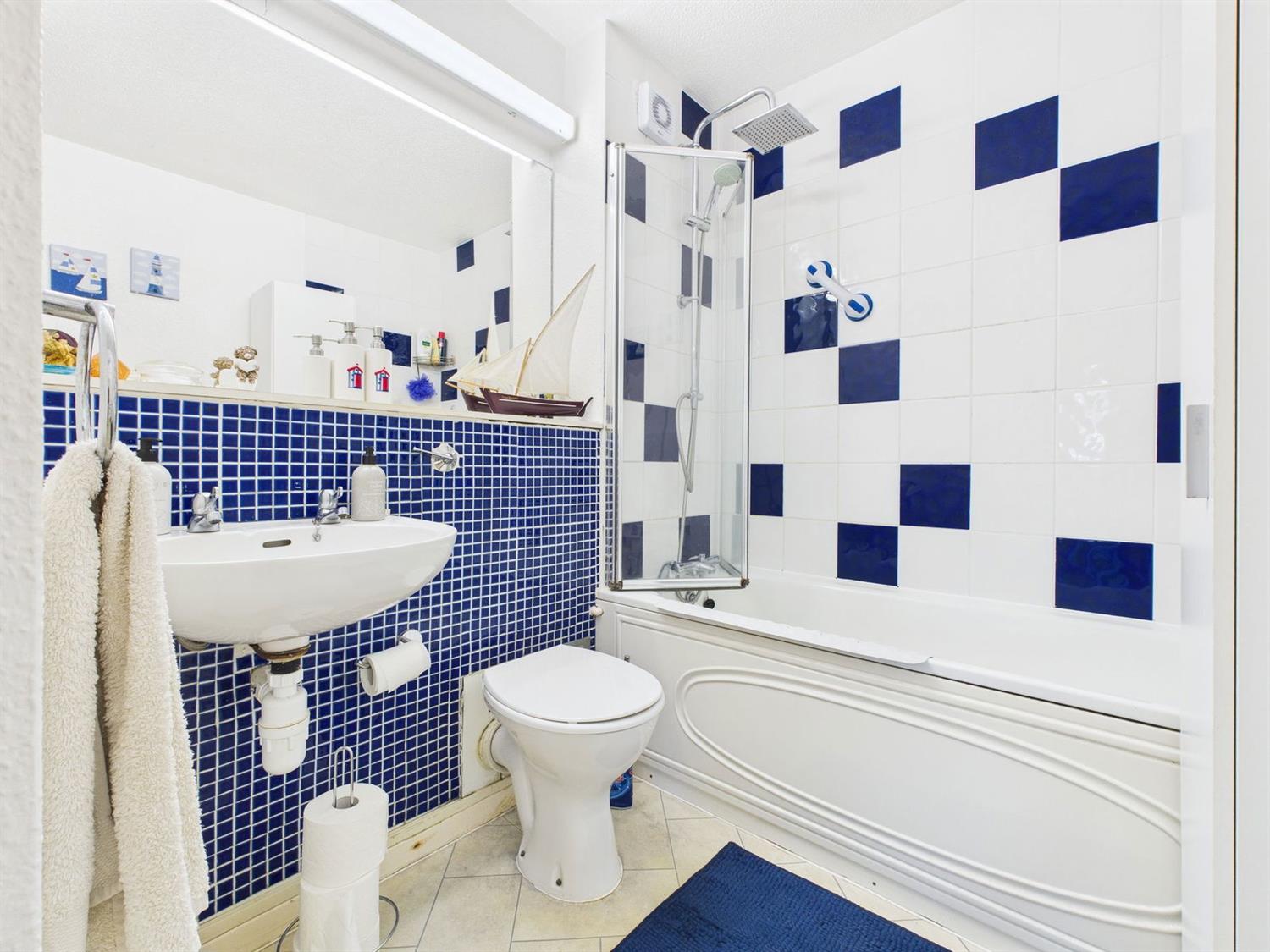 BathroomThe bathroom comprises an enclosed panel bath with mixer taps, a handheld shower attachment, and an overhead rainfall shower. There is a low-level WC, wall-mounted wash hand basin, radiator, extractor fan, and a large storage cupboard with shelving.