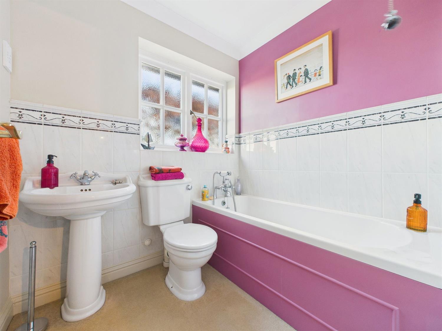 Family BathroomComprising a panel enclosed bath with mixer taps and handheld shower attachment, low-level WC, and pedestal wash hand basin with mixer tap. The room also features a radiator, half-height wall tiling, an obscured side-aspect window, a shaver point, and extractor fan.