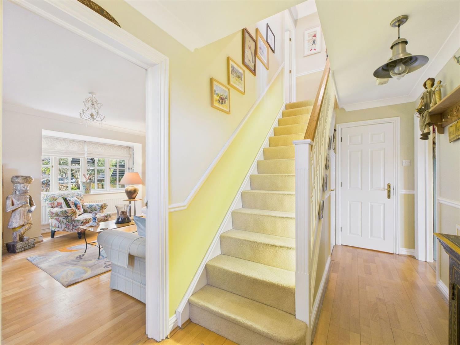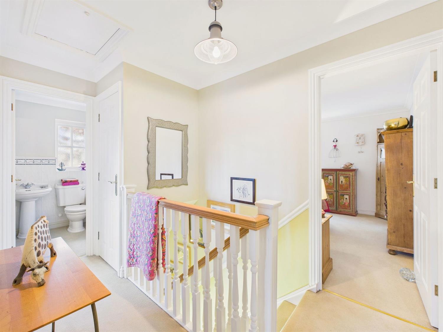 First Floor LandingStairs with low level lighting rise to the first-floor landing, where there is a radiator, airing cupboard, and loft hatch with drop down ladder providing access to the fully boarded loft space.