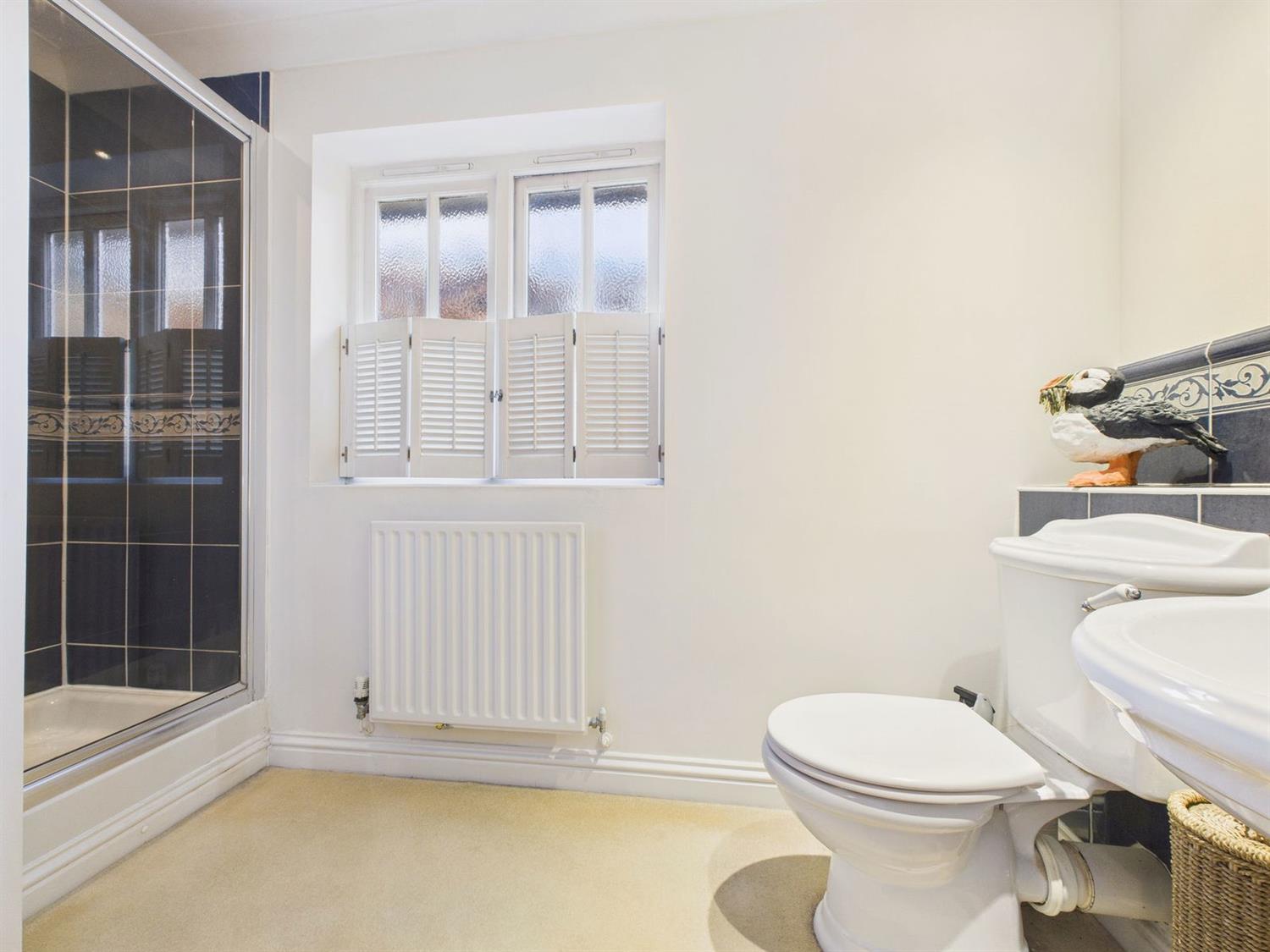 Ensuite Shower RoomFitted with a white suite comprising a low-level WC, pedestal wash hand basin with mixer tap, and a walk-in shower cubicle with concealed mixer and handheld shower attachment. Additional features include an obscured side-aspect window with half-height shutters, a radiator, a shaver point, and downlighting.