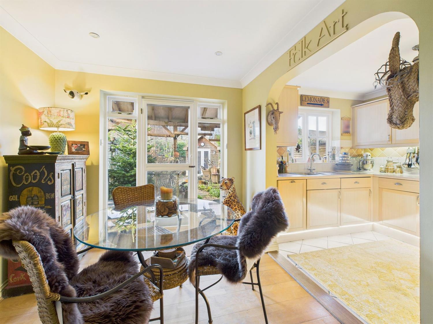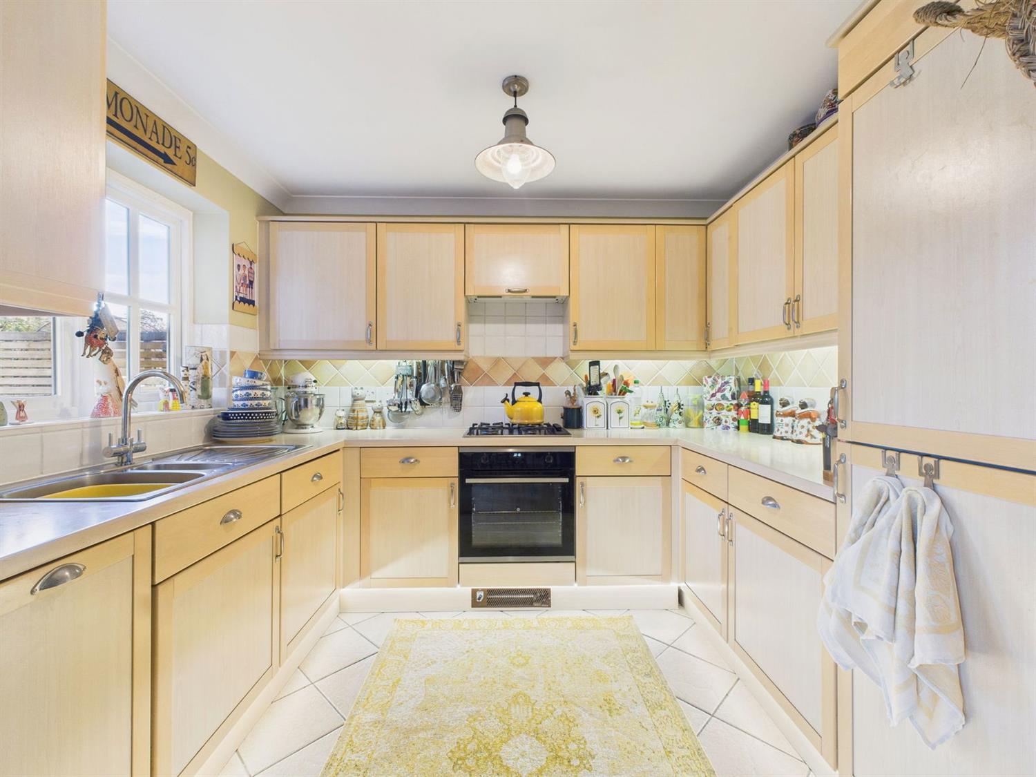 Open-Plan Kitchen / Dining RoomThe modern kitchen is fitted with a comprehensive range of eye and base level cabinets and drawers with complementing worktops over. Integrated appliances include a slimline dishwasher, washing machine/dryer, electric oven with four-burner gas hob and concealed extractor over, and a fridge freezer. A stainless-steel one and a half bowl sink and drainer with mixer tap is positioned to enjoy views over the rear garden. Additional features include under-cabinet lighting and tiled flooring. An arched opening leads through to the dining area, which offers ample space for a good-sized dining table and there is downlighting, a radiator, and a door with glazed side panels opening onto the rear veranda.