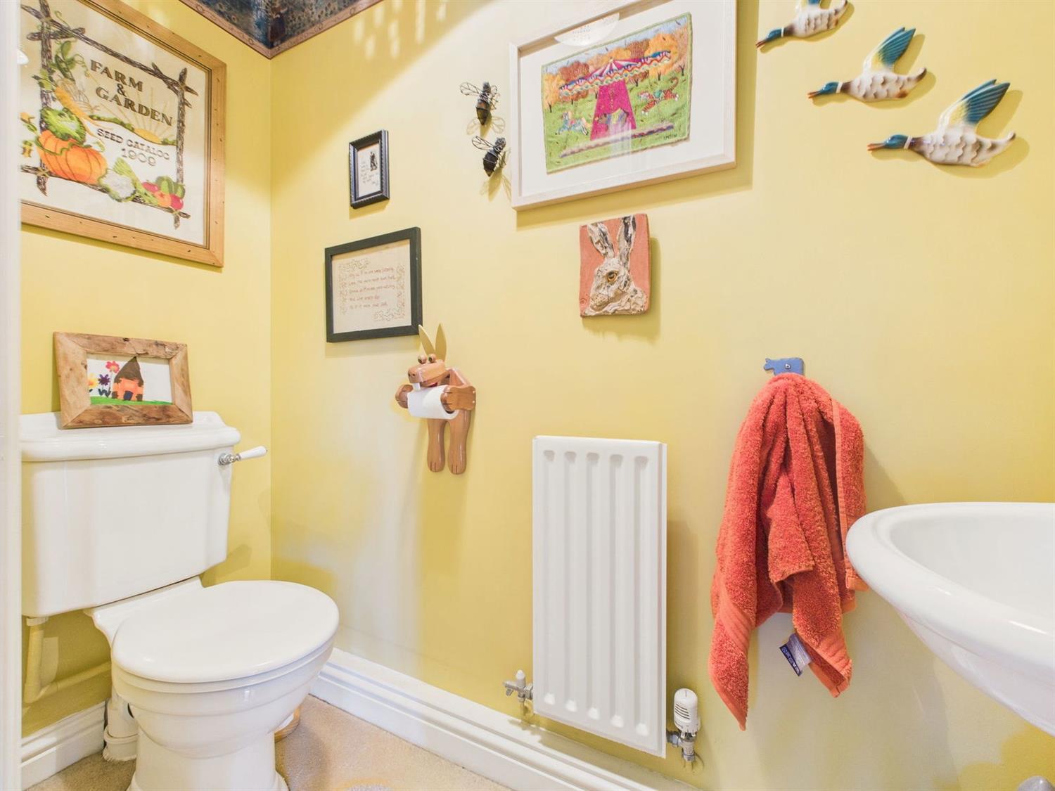 CloakroomComprising a low-level WC, wall-hung wash hand basin with taps, and a radiator.