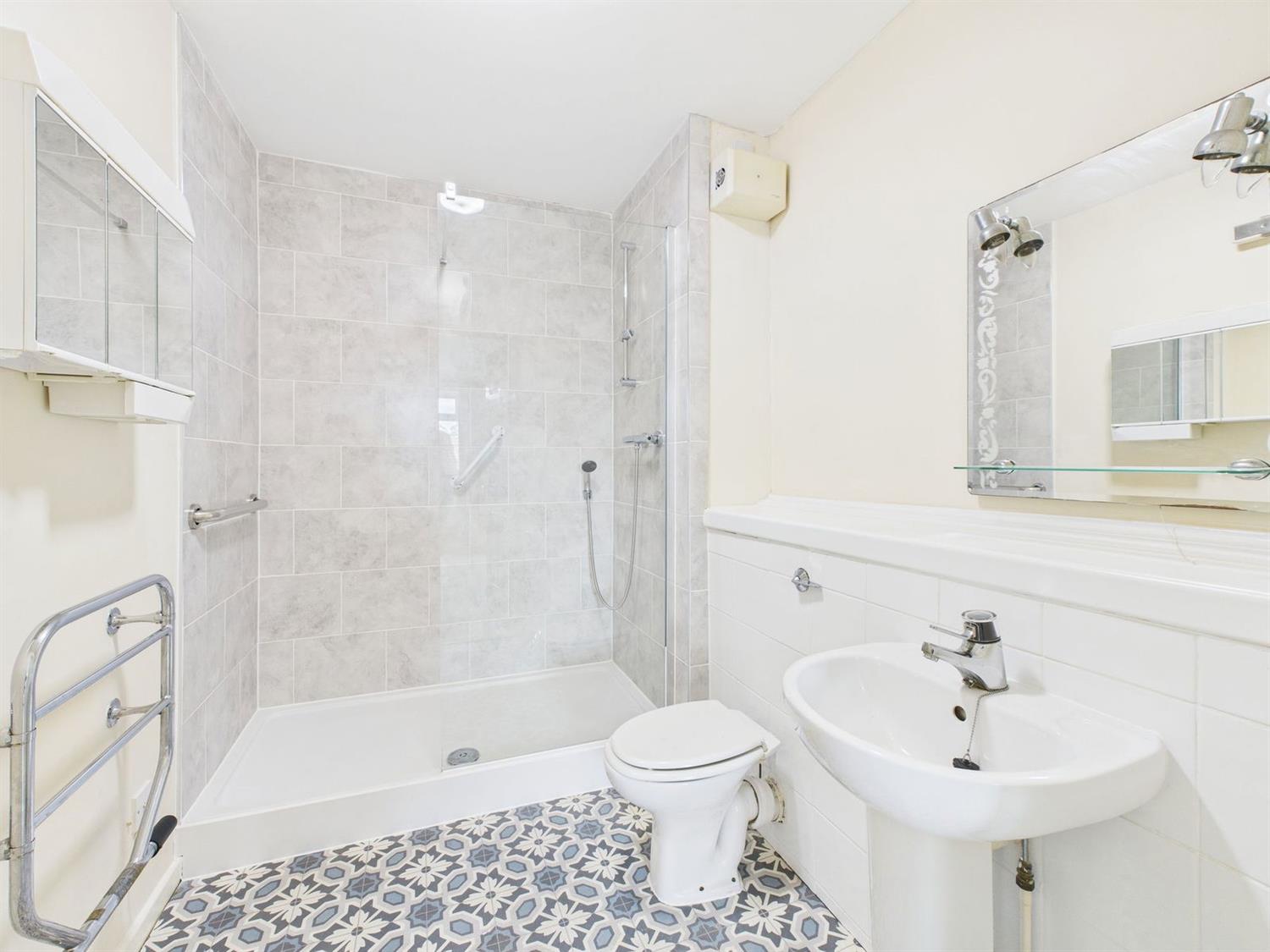 With a full-width over-size shower cubicle having a chromium thermostatic shower control, wall bracket and hand shower and a glass screen, pedestal wash hand basin, vanity shelf with back to the wall w.c., shaver point, chromium towel warmer, Greenwood Airvac extractor fan, illuminated mirror.