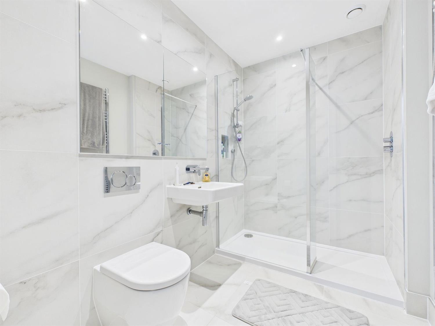 With full width walk in shower cubicle, having chromium thermostatic shower control, wall bracket and hand shower and glass shower screen, back to wall WC with dual flush, wall mounted wash hand basin with chromium mixer tap, recessed mirrored cabinet, tiled walls and flooring, chromium towel warmer.