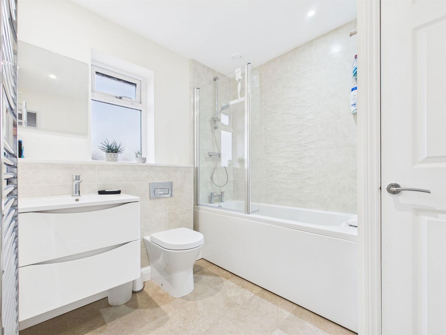 Family BathroomFrosted double glazed rear aspect, fitted with a modern white suite comprising panel bath with tiled walls, chromium mixer tap, chromium thermostatic shower control, wall bracket and hand shower, glass shower screen, extractor fan, vanity wash hand basin with chromium mixer tap and drawers under, RAK back to wall WC, chromium dual flush, marble vanity shelf with wall mirror, chrome towel warmer, downlighting, airing cupboard with hot water tank and shelving.